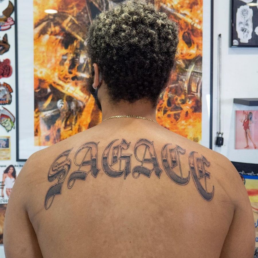 Sagace - last name tattoo by Mike End #MikeEnd #lettering #name #backtattoo #letters #font