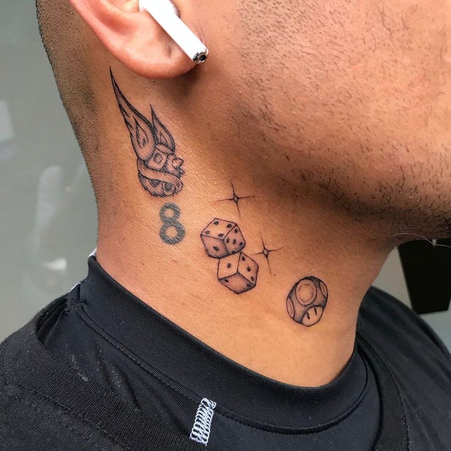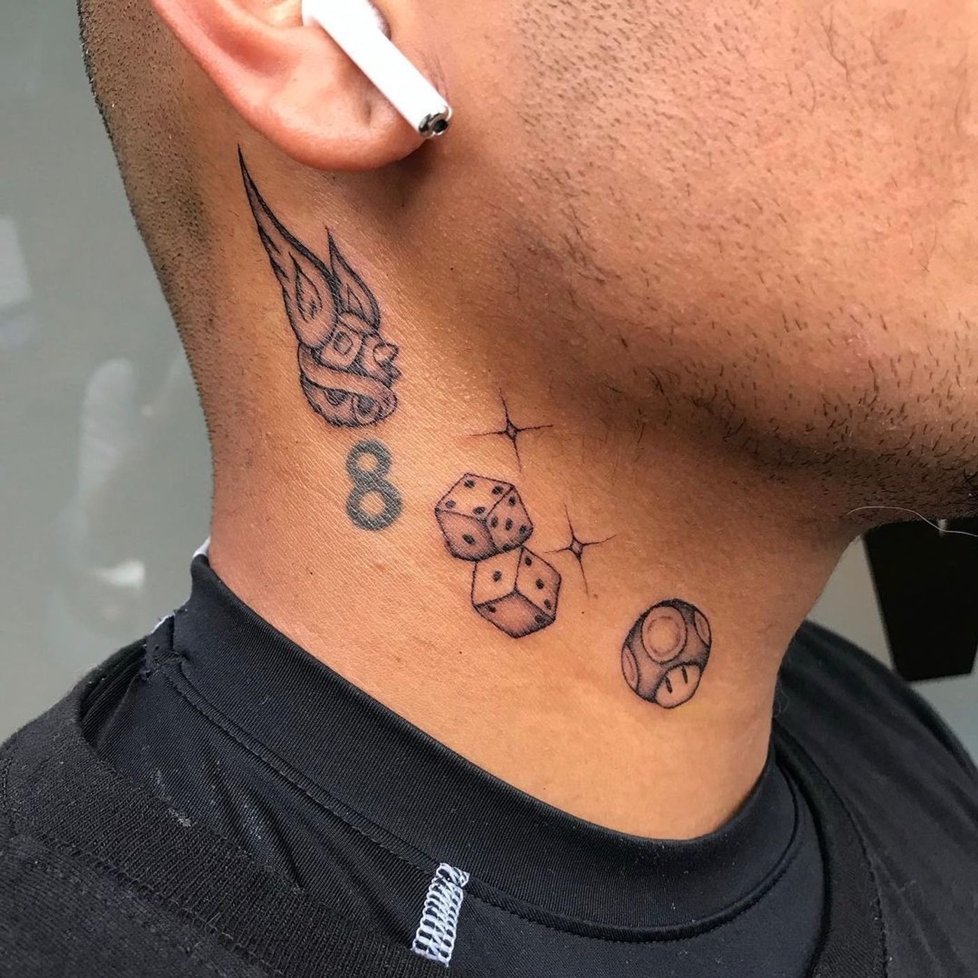 Small neck tattoos by Miss Preciouss #MissPreciouss #dice #mushroom #mario #nintendo #sparkle #illustrative #chicano