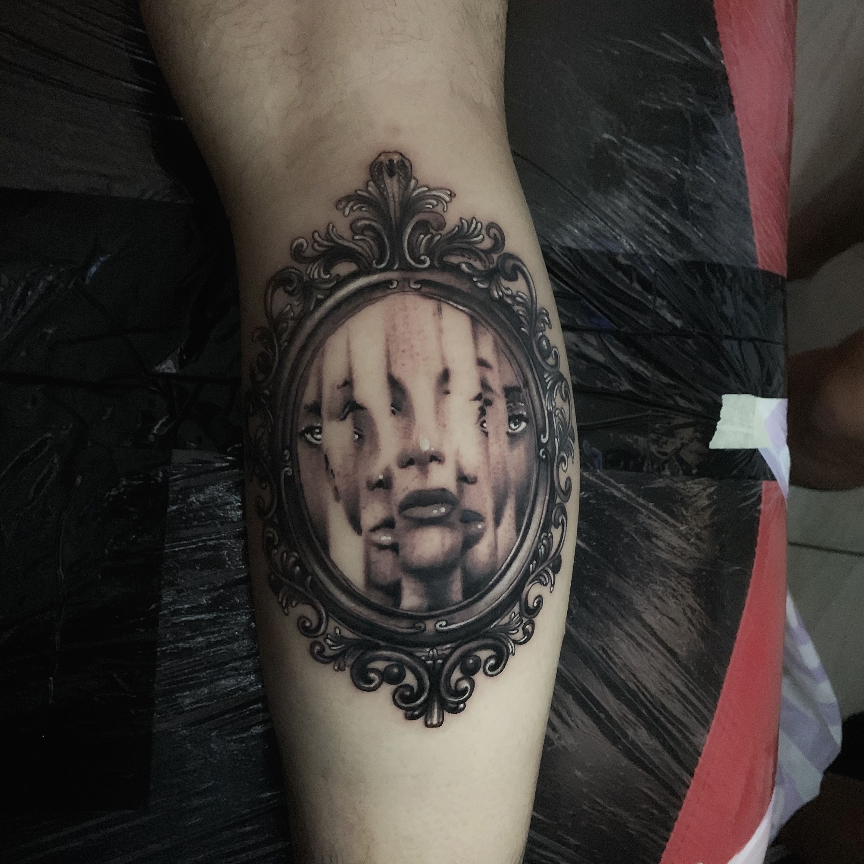 Capture the beauty of a woman gazing into a mirror, surrounded by intricate filigree and framed by Marcel Oliveira's illustrative style on your forearm.