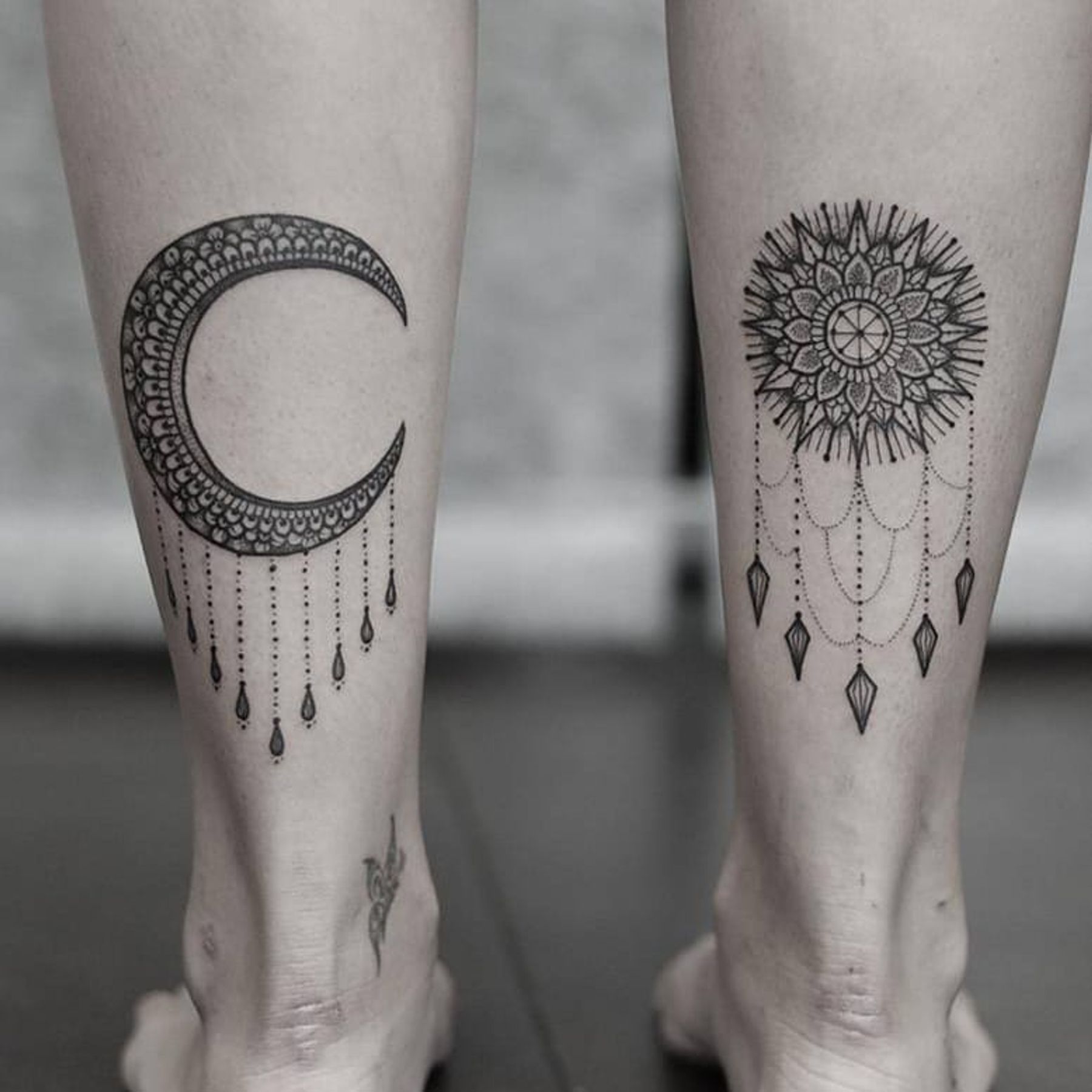 Moon and sun as pair tattoos #moontattoo #suntattoo #chandelier #ElBernardes #moon #sun #pairtattoo
