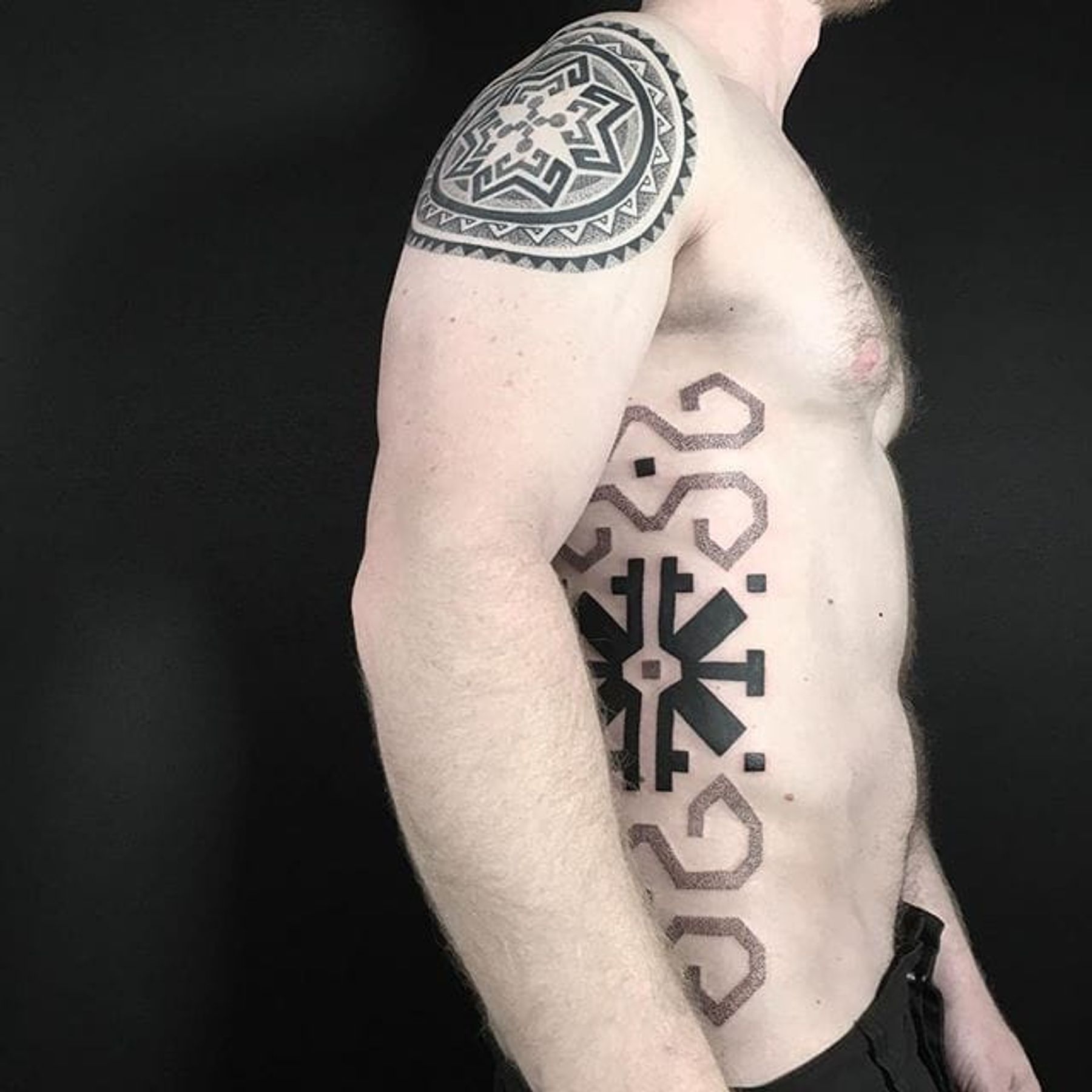 Latvian design on the ribs by Seth Arcane. #dotwork #SethArcane #Latvian #pattern #blackwork