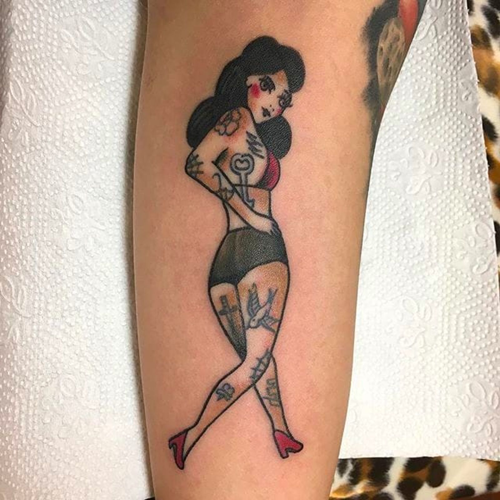 Rad looking tattooed pinup girl done by Wilson Ng. #WilsonNg #BoldTattoos #traditionaltattoo #pinup #traditional #tattooedgirl