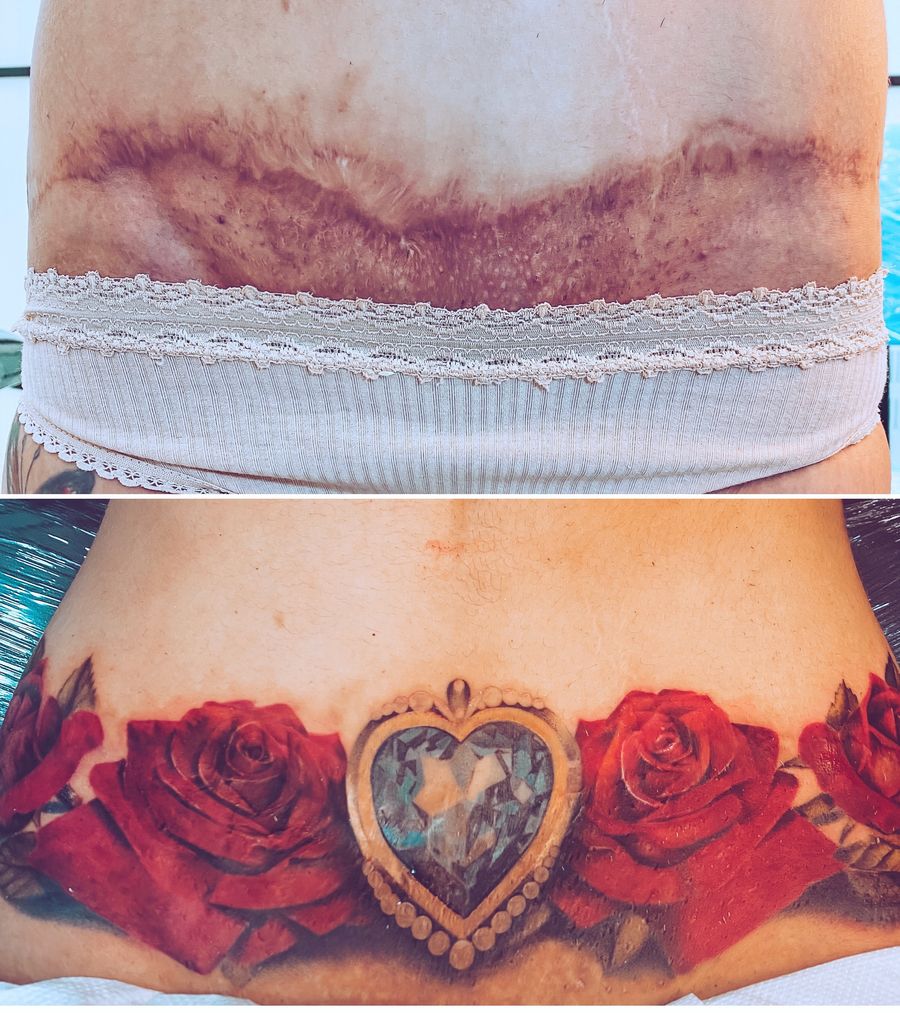 Cobertura de cicatriz. Jóia e rosas. Realismo colorido.