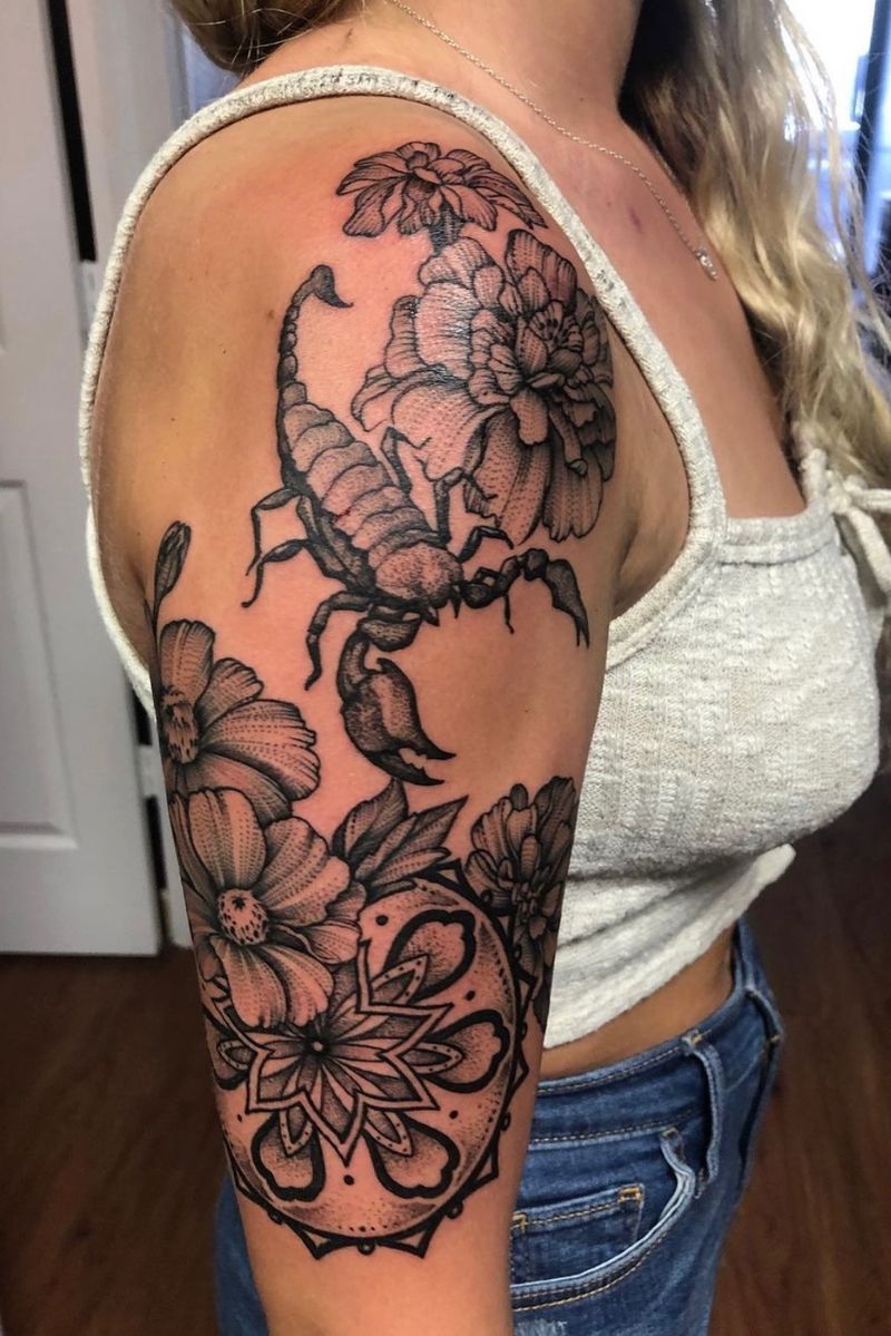 B&G scorpion, marigolds, and mandala - Done by Jacob Kearny at Two Olives in Chicago #dotwork #chicago #scorpion #mandala #marigold #flowers #blackandgrey