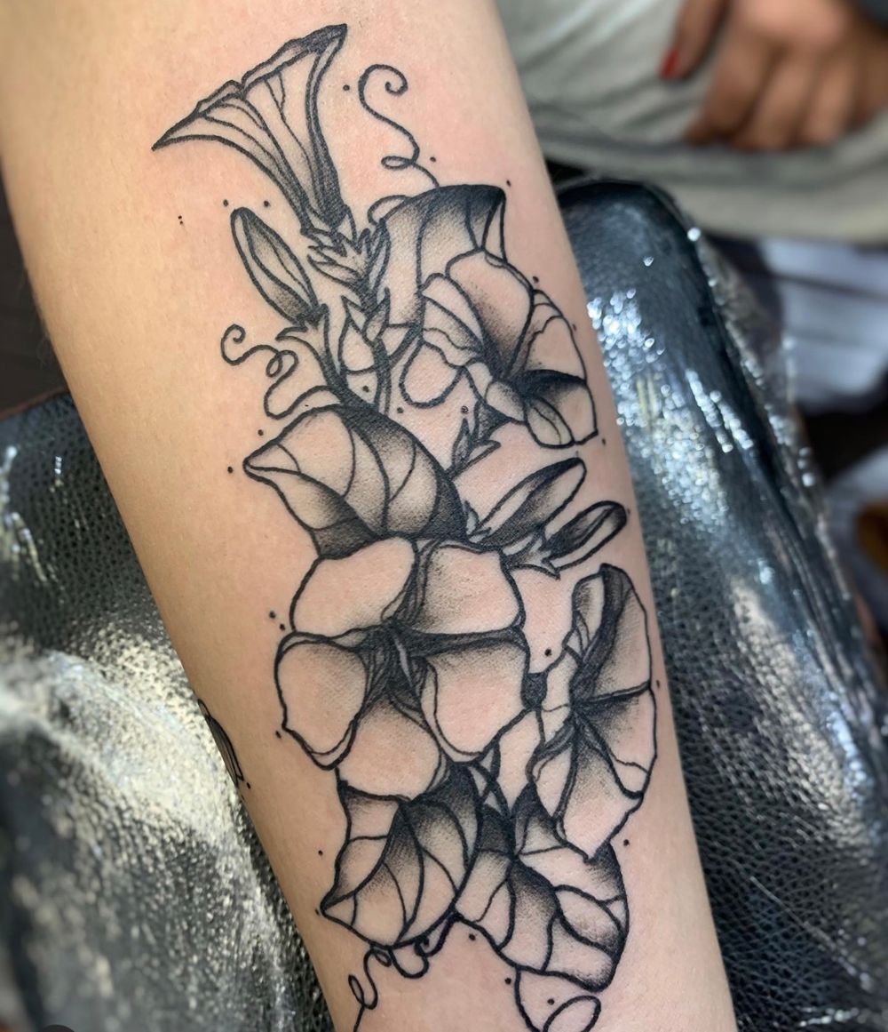 Some morning glory flowers on the inside of the forearm. #tattoos #tattooed #womenwithtattoos #ladytattooers #neotraditionaltattoo #botanicaltattoo #floraltattoo #morningglory #blackandgreytattoo #solidink #fkirons #tattooedgirls #dayton #daytonohio #miamisburg #ohiotattooers #blackworktattoo