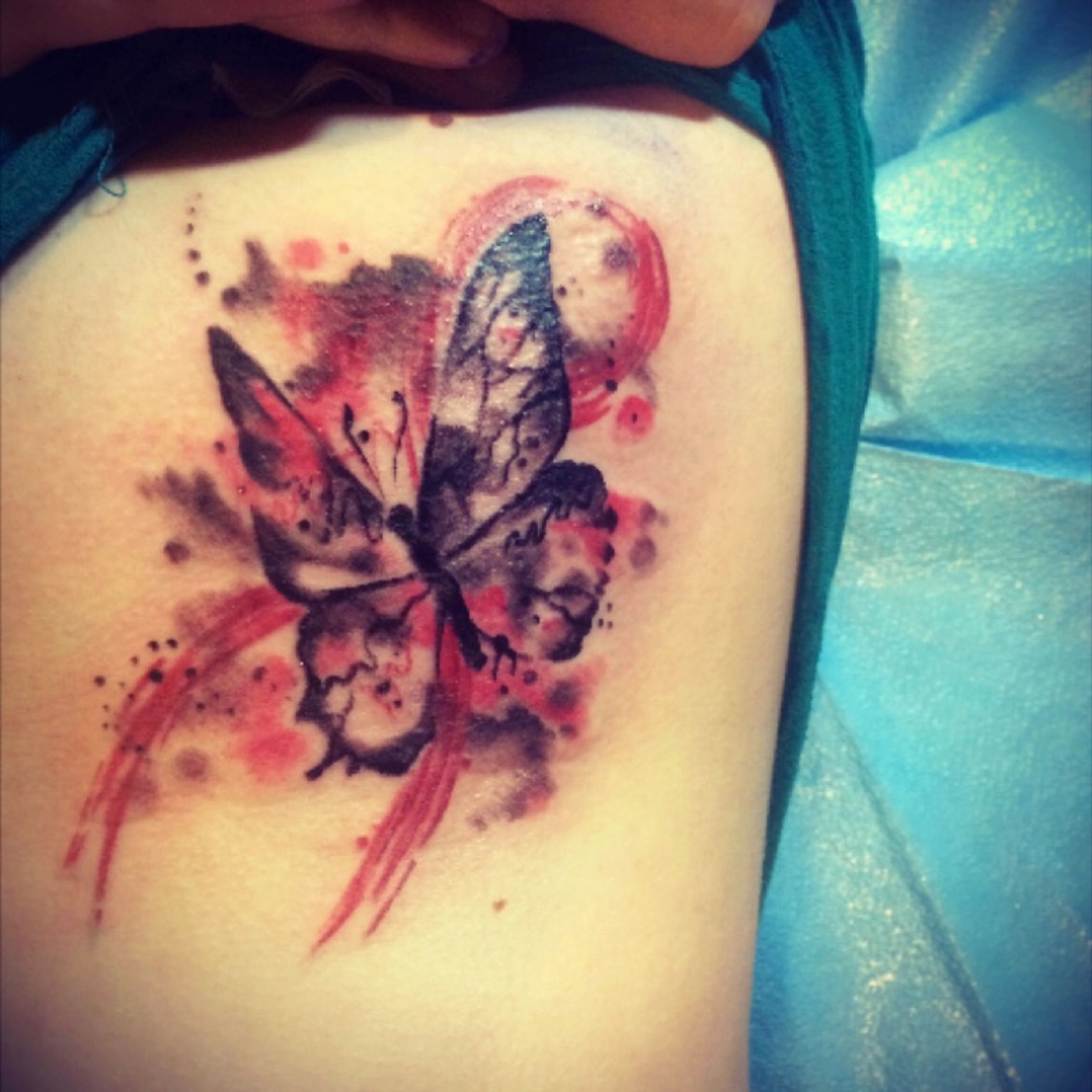 For my first tattoo: My mother had breast cancer and on her 1 year anniversery of her remission i got this tattoo for her. Its onthe side of my ribs and left breast because that is where they found her cancer. My aunt also passed away from beast cancer 7 years before and all of her daughters got a butterfly with a cancer ribbon tattoo. This is my way of honoring them both. My heroes #butterfly #butterflytattoo #watercolor #breastcancer #cancertattoo