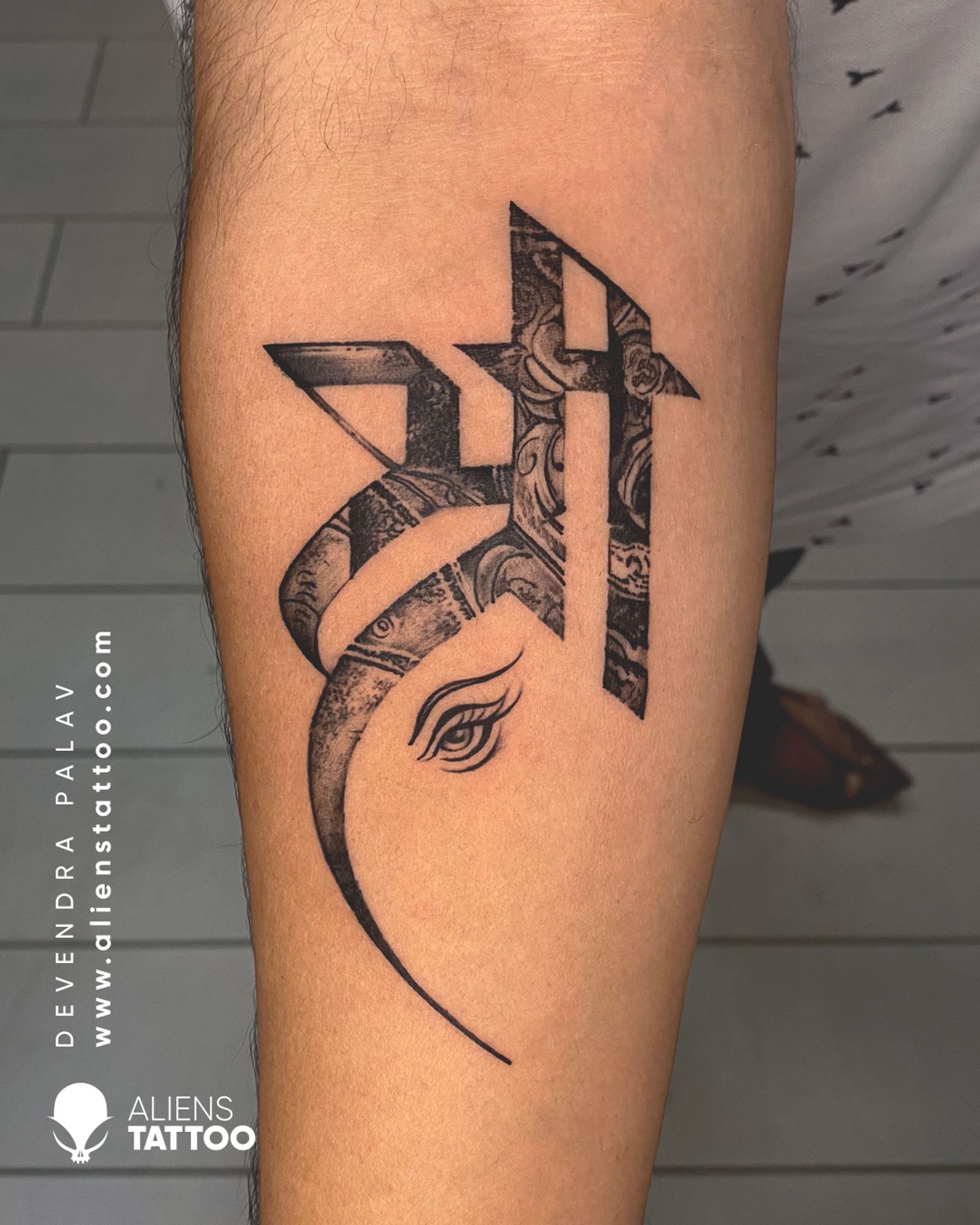 If you wish to get this tattoo visit our website www.alienstattoo.comAmazing Shree Calligraphy Tattoo By Devendra Palav at Aliens Tattoo India.