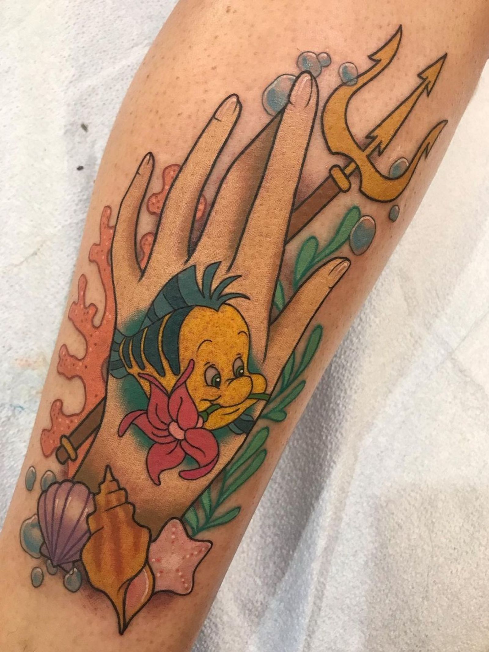 Little Mermaid tattoo by rachwilltattoo #rachwilltattoo #littlemermaid #ariel #flounder #fish #shells #trident #hand #disneyprincess #princess #disneytattoo #disney #waltdisney