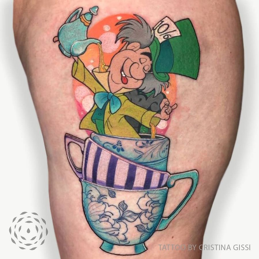 Alice in Wonderland tattoo by Cristina Gissi #CristinaGisse #Aliceinwonderland #alice #wonderland #madhatter #tea #teacup #disneytattoo #disney #waltdisney