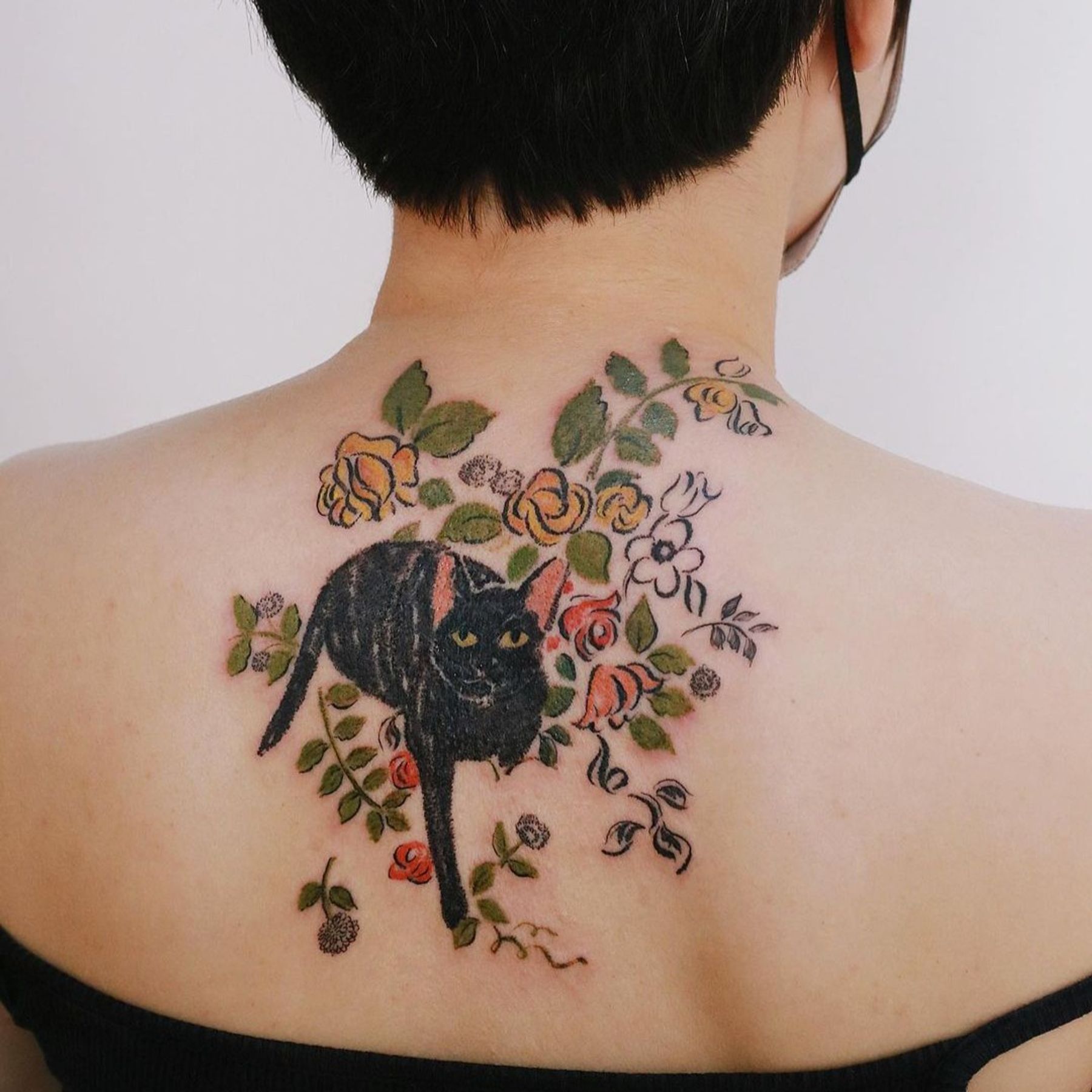 Oil pastel tattoo by Gong Greem #GongGreem #oilpastel #painterly #watercolor #color #floral #flower #nature #plant #cat #kitty #animal