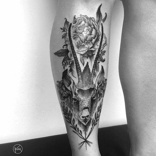 By #ikaatattoo #antelope #antlers #peony #flower #blackwork #linework