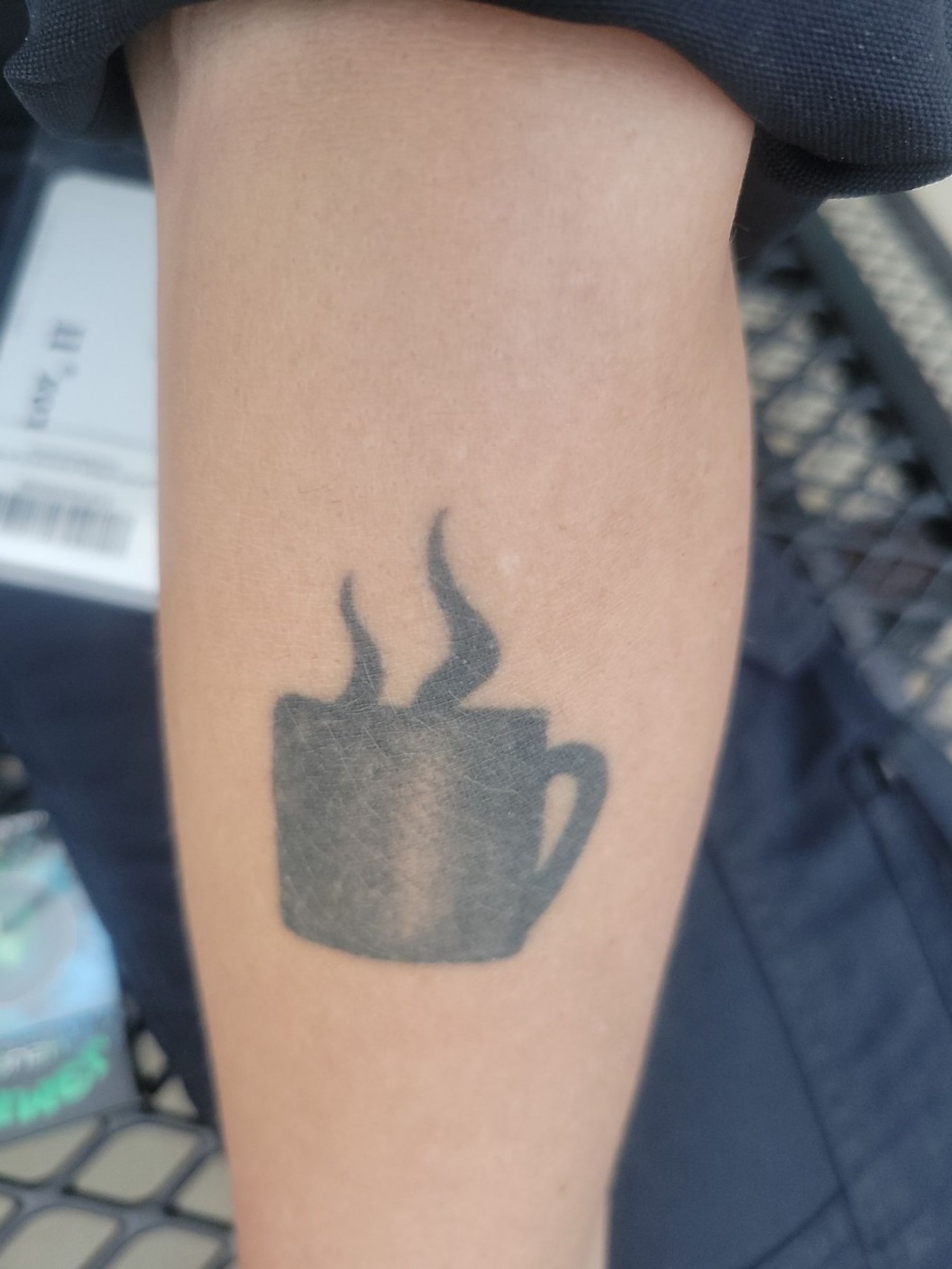 Coffee cup. Part 2 of a couples tattoo, my husband has the tilted coffee cup. When we hold hands his pot pours into my cup