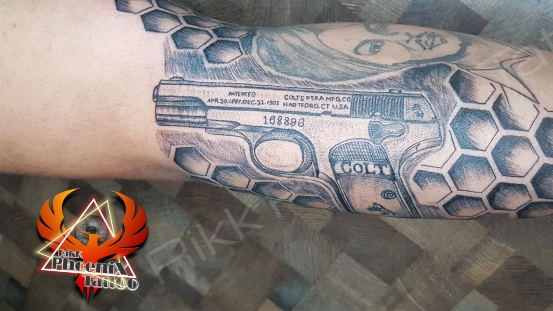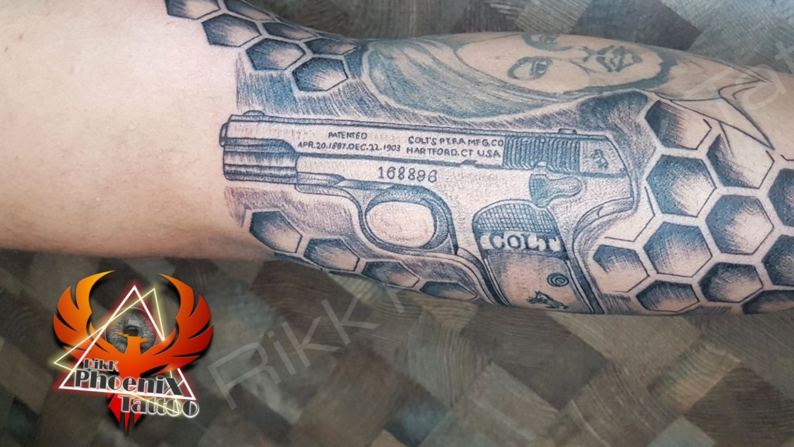 #bhagatsingh #colt #pistol #proudtobepunjabi #punjabi #historical #realstory #rajguru #sukhdev #bhagatsinghji #tattoo #tattoolife #tattoooftheyear #coltguns #1928 #hartford #usa #fullsleevetattoo #beehives #portrait #ink #inked #tattoodesign #power #motivation #elbowtattoo #punjab #fanofbhagatsingh