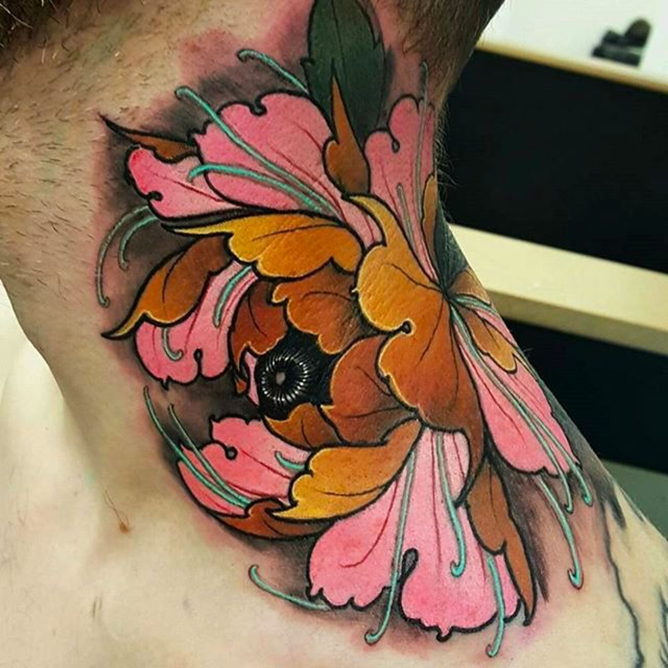 Peony flower neck tattoo by Elliott Wells #peony #peonies #flower #japanese #ElliottWells #triplesixstudios