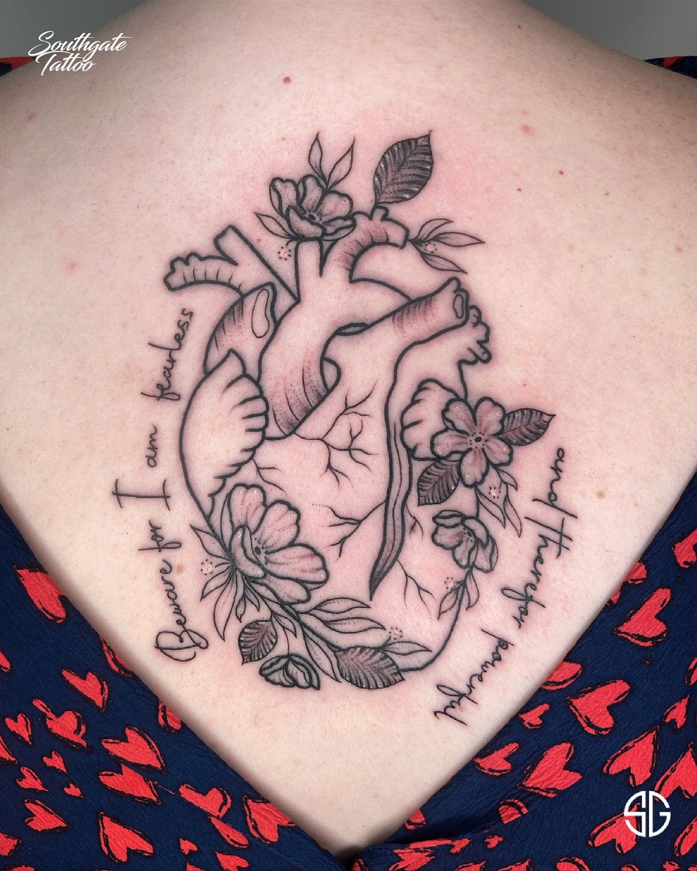 #hearttattoo #fearless #powerfull #southgatetattoo #sgtattoo #sg #londontattoo #backtattoo #lineworktattoo #heart #flowers