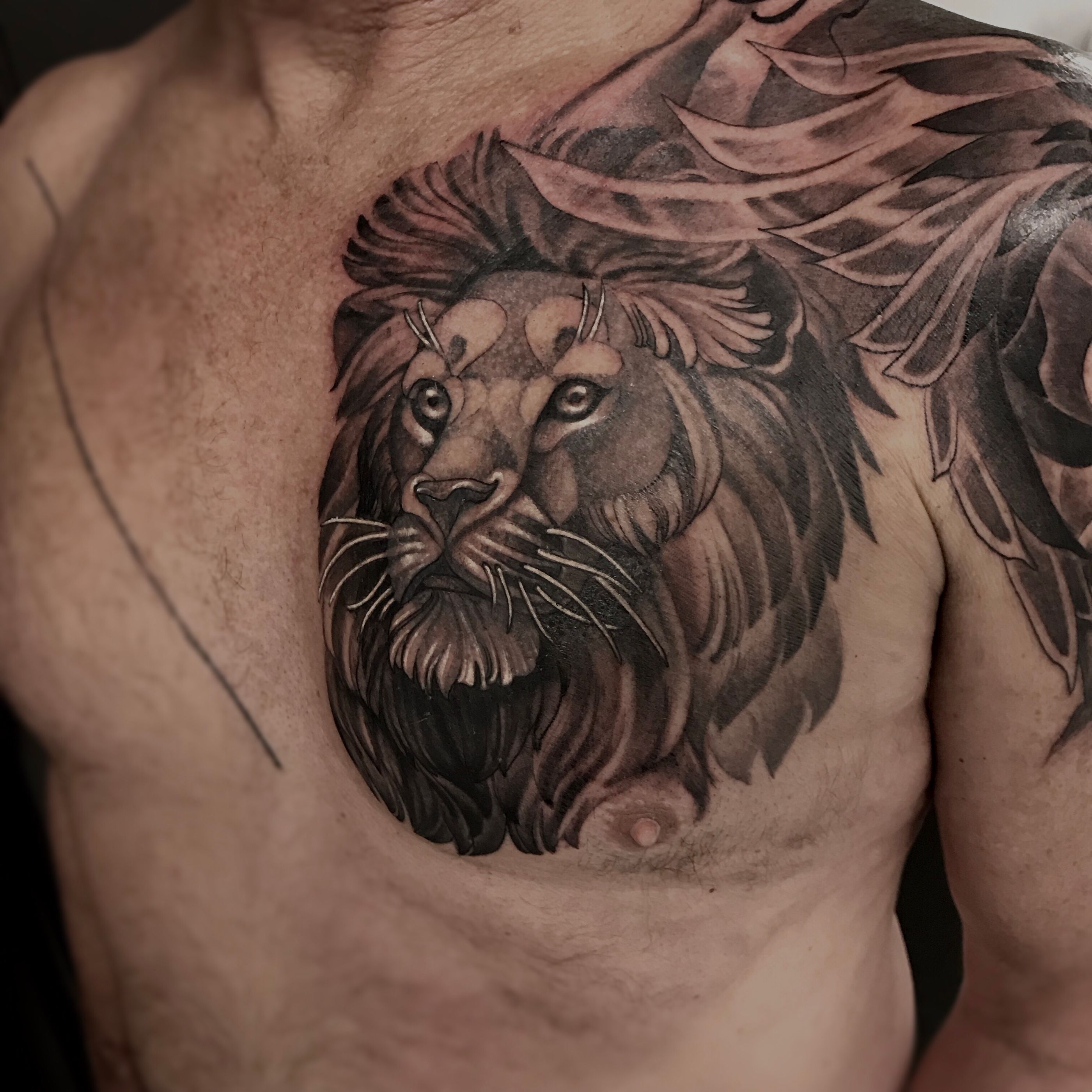 Lion chest piece with dragon on shoulder . #liontattoo #lion #neotrad #illustration