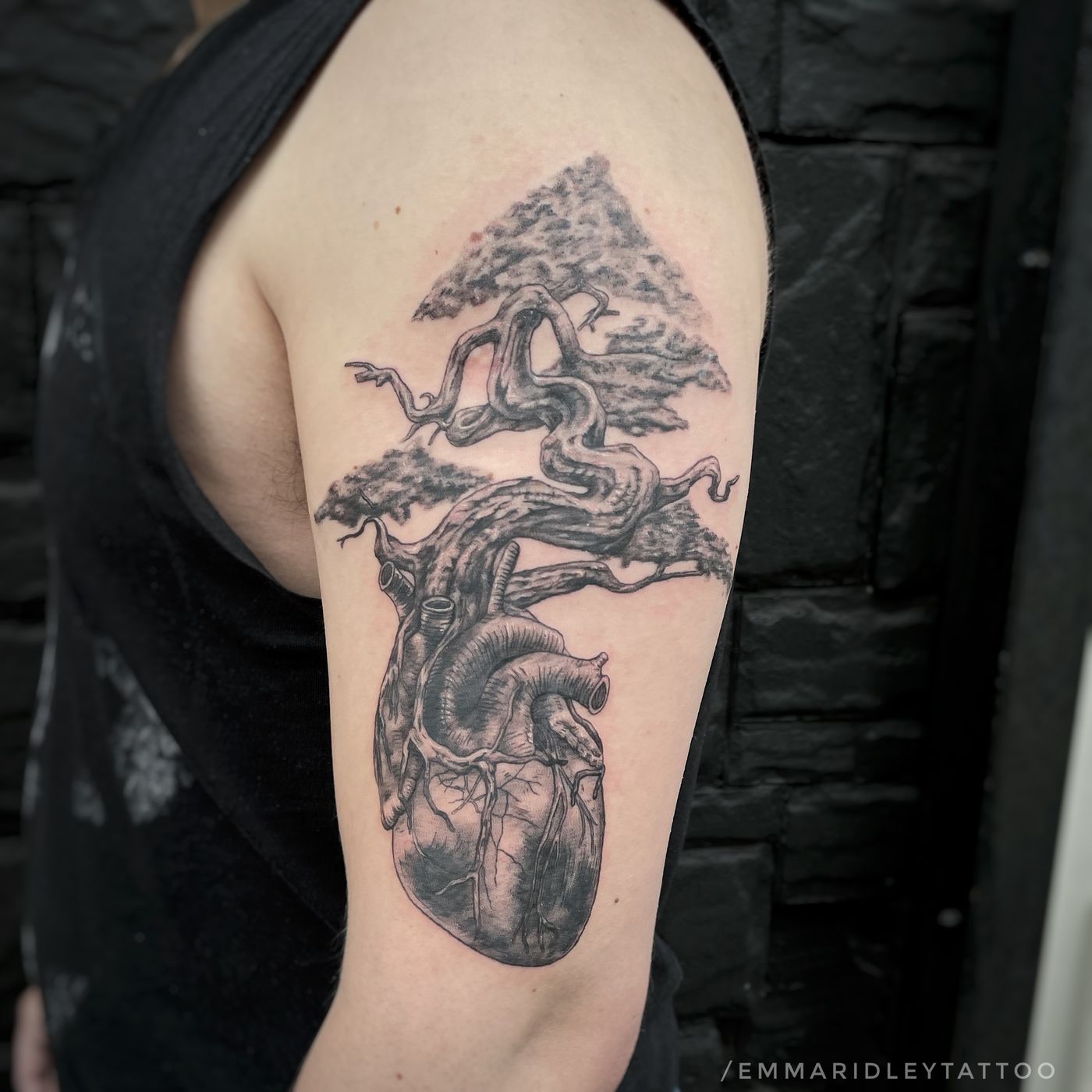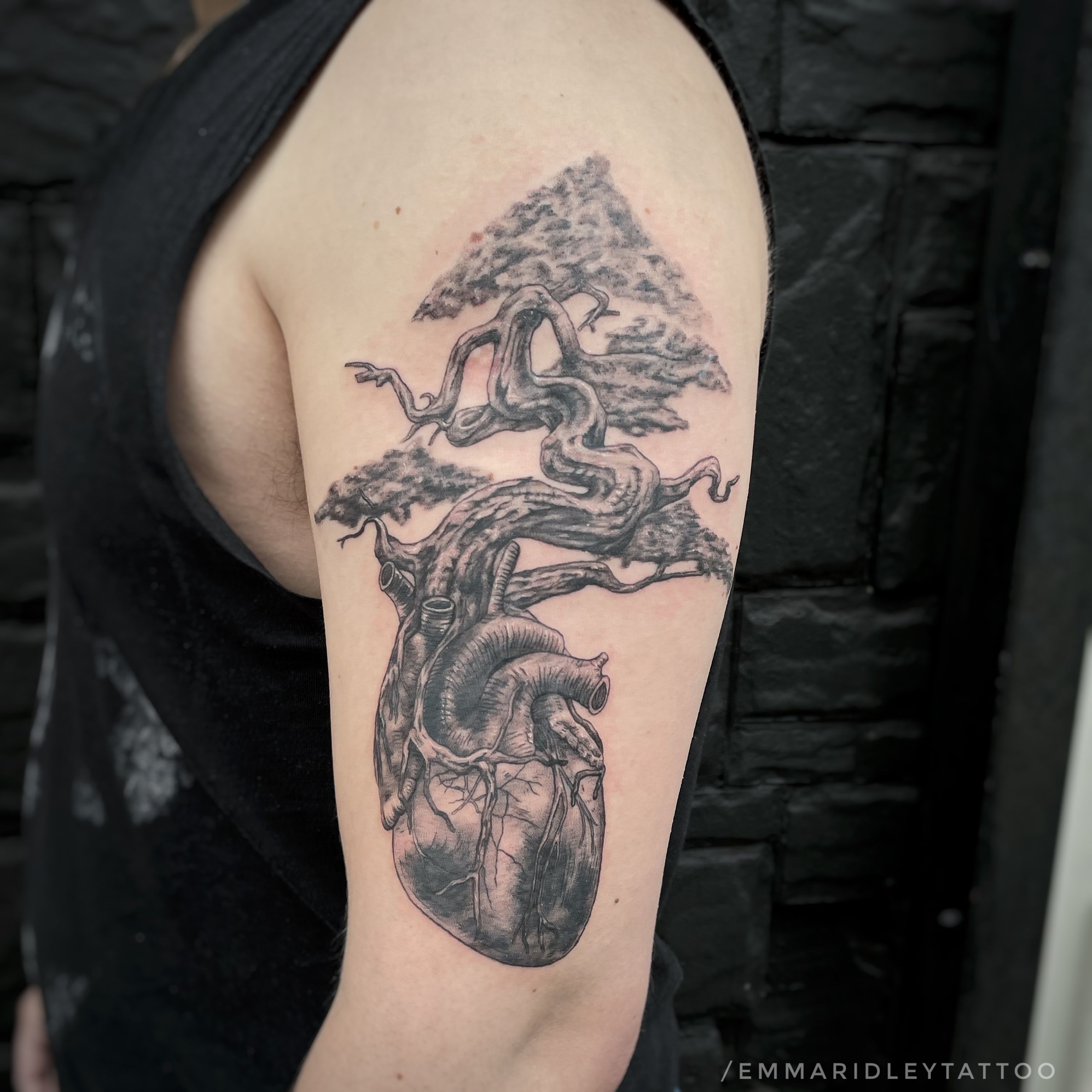 Juniper bonsai tree with its roots wrapped around a human heart. Visit www.Instagram.com/EmmaRidleyTattoo to see the photos in better quality and to book in.