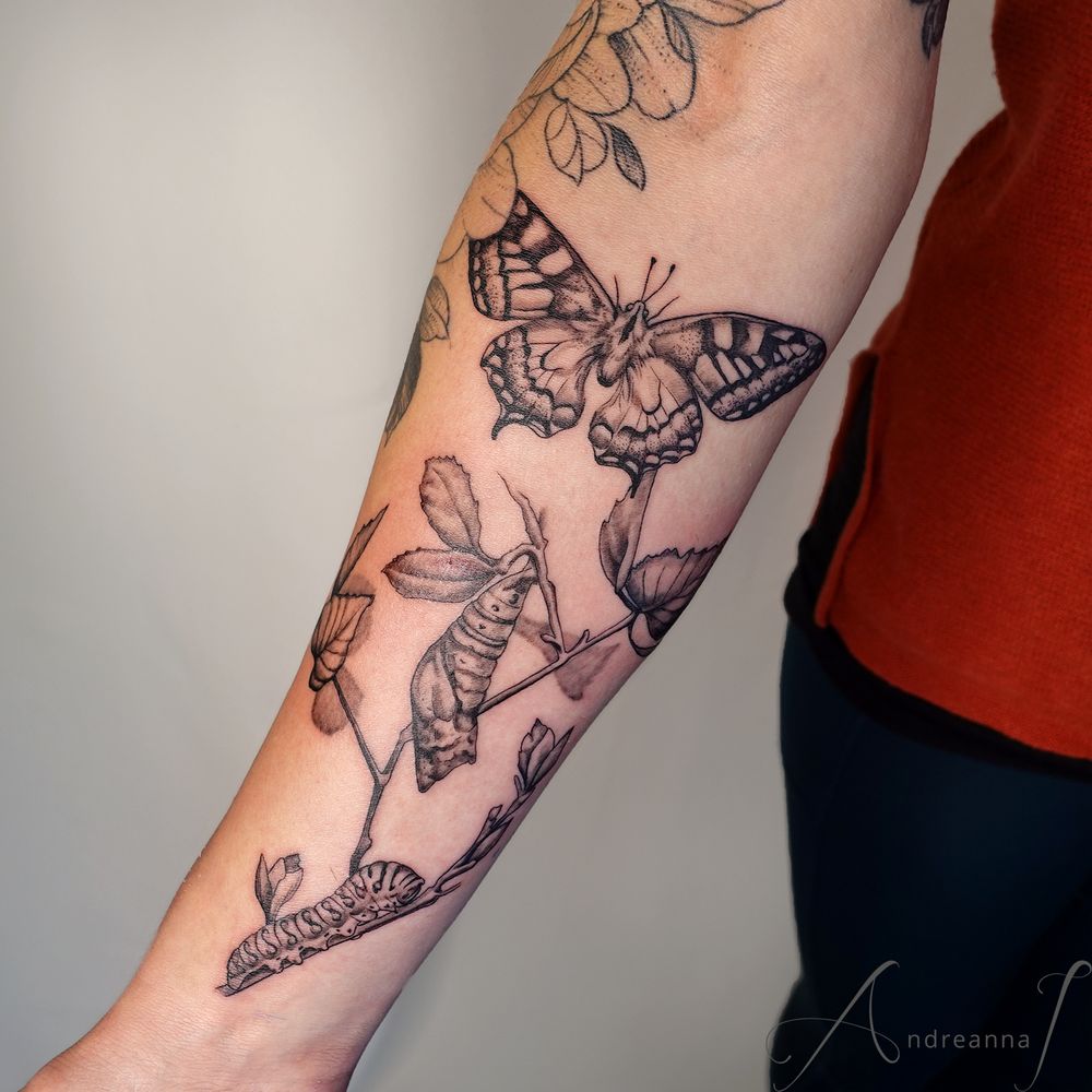 Evolution of a Butterfly Tattoo by Andreanna Iakovidis #butterflytattoo #finelinebutterfly #caterpillar #realisticbutterfly #delicatebutterflytattoo #butterflyforearmtattoo