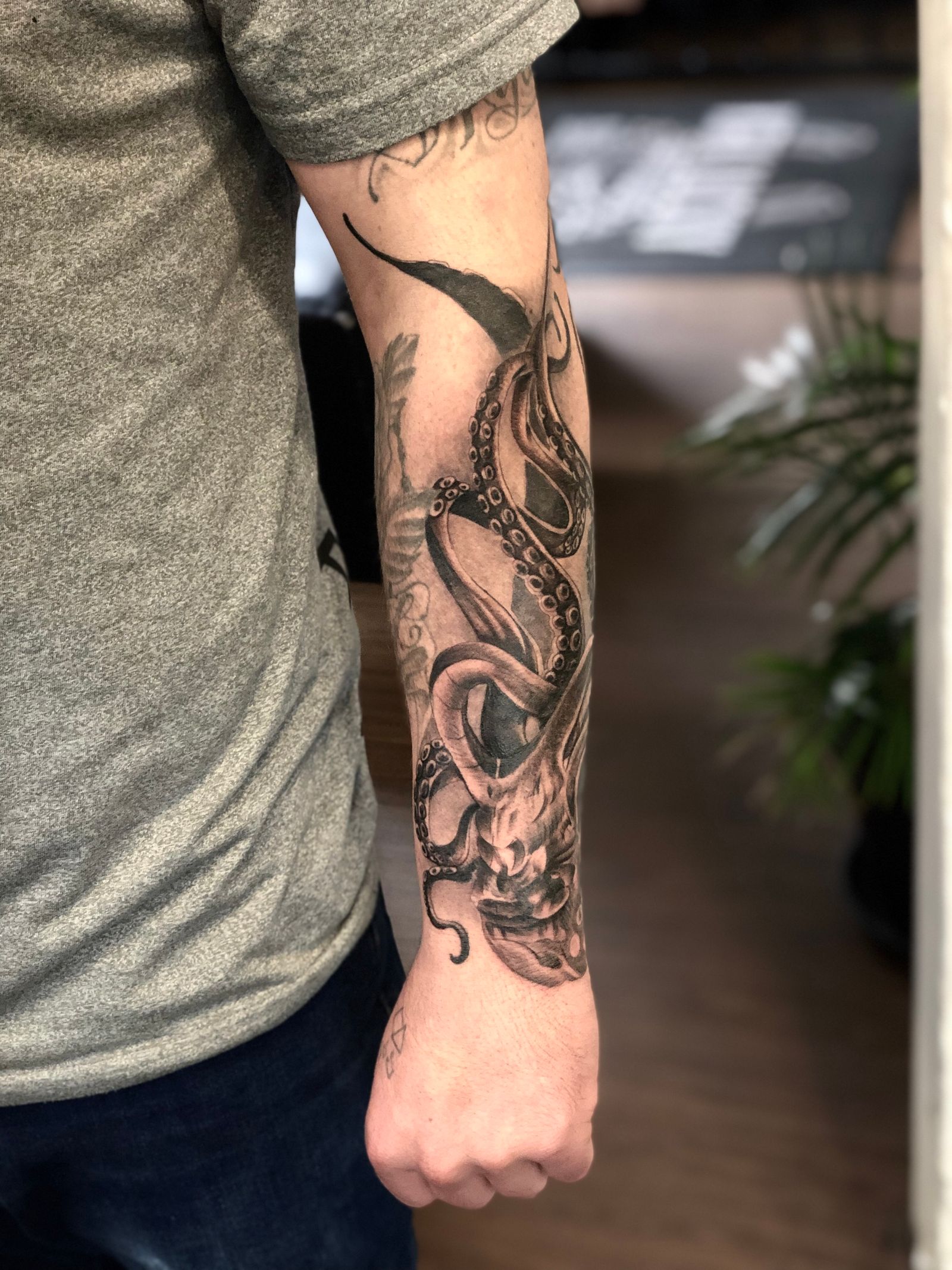 This awesome #octopus half sleeve in progress by @garethdoyetattoos on Josh is 🔥