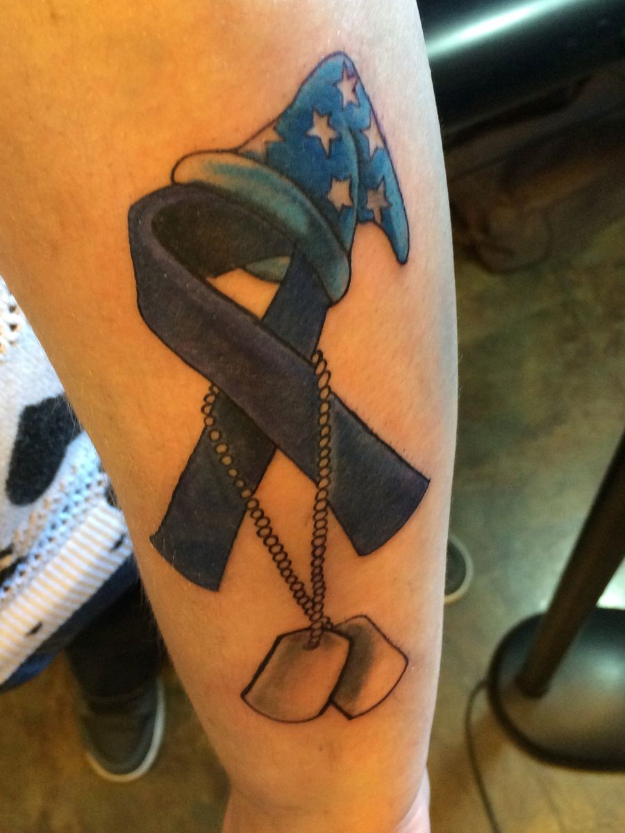 My Huntington’s Disease Awareness tattoo. The Mickey sorcerer hat represents my sister and the dog tags represent my brother. I am looking to add to this