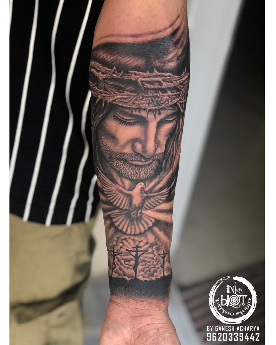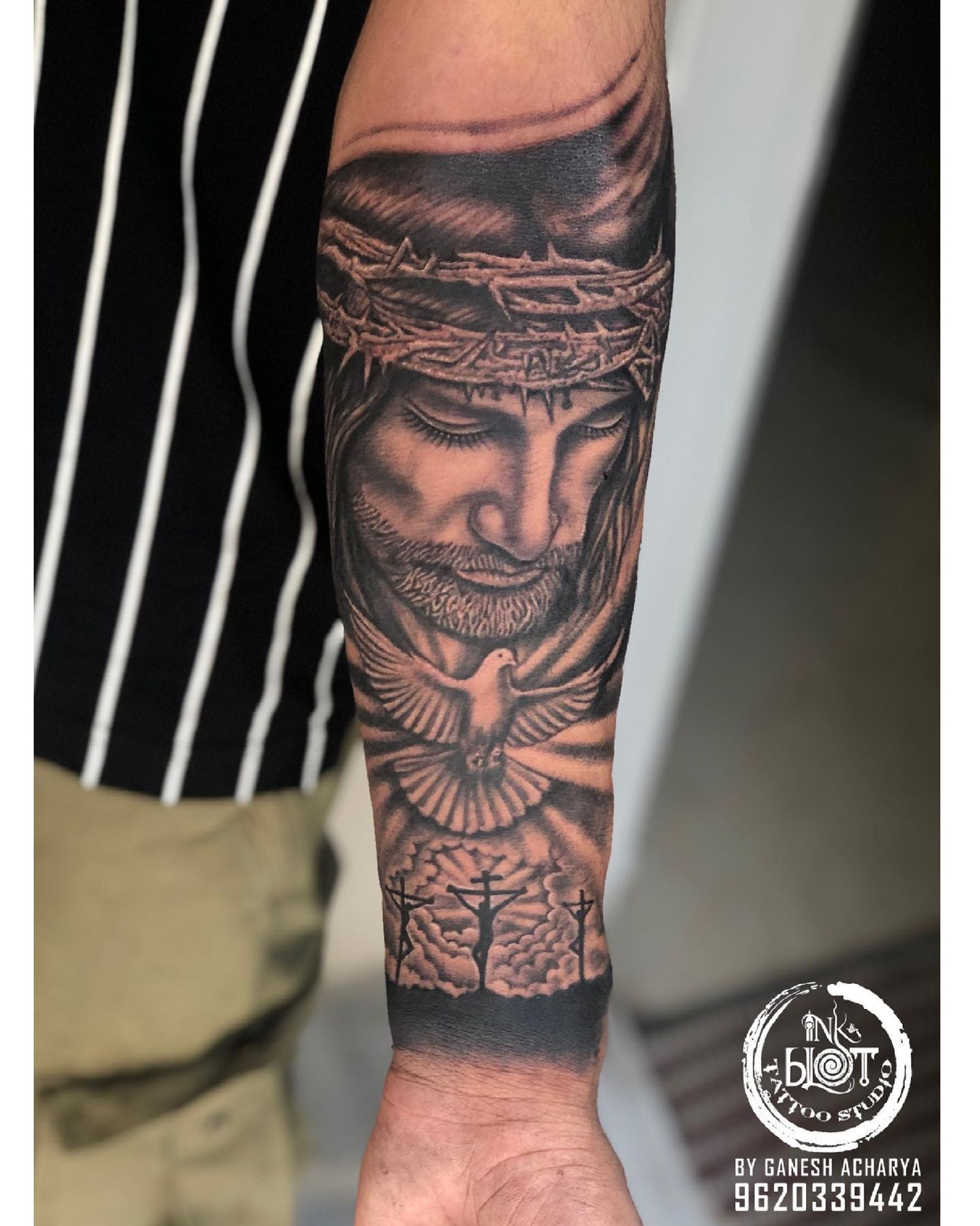 Jesus Chirst -Tattoo with the image of Christ is a sign of strong faith and a desire to help people. People wearing a tattoo want to say this ,that all are ready for the sake of the people close to them we were happy . Thanks for the trust 🙏 Book ur appointment:9620339442 #jesus #jesuschrist #jesusquotes #jesustattoo #christtattoo #blackngreytattoo #tattoo #tattooideas #tattoos #tattoosleeve #tattoodesign #handtattoo #holyspirit #tattooartist #tattooart #tattoogirl #tattooworkers #tattoolove #tattooshop #tattooinspiration #tattoolovers #tattoosnob #tattoolover #crosstattoo #banglore #jayanagar #jpnagar #inked #inkedup #sleevetattoo — Inkblot tattoo & art studio