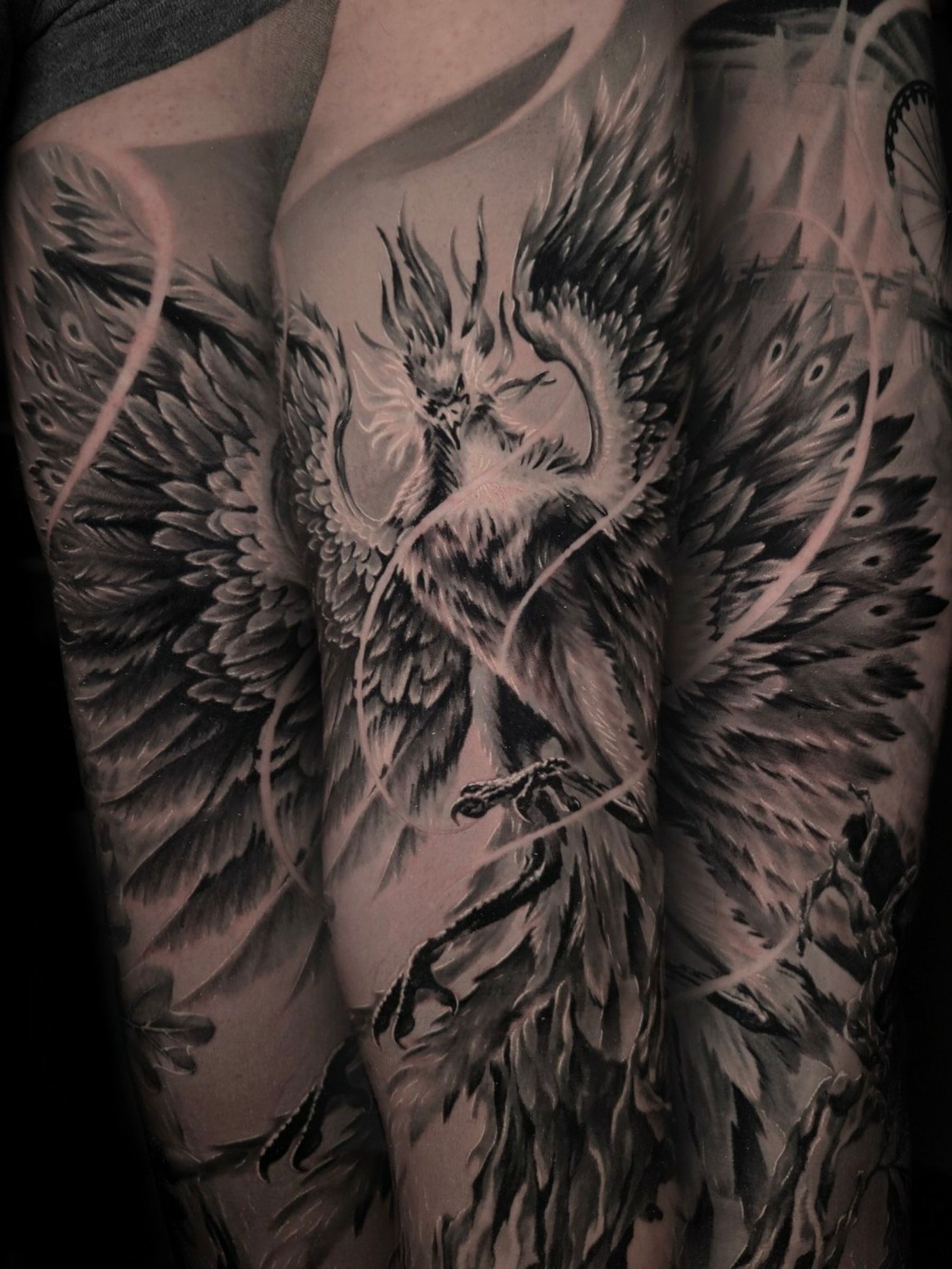 Leg sleeve in progress #legtattoo #birdtattoo #solidink #greytattoo #lietuvostattoo