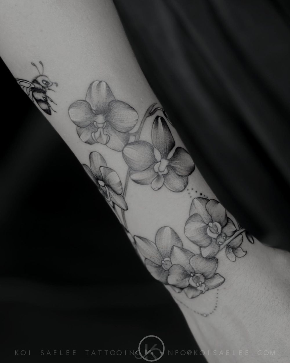 #ecofriendly #finelinetattoo #womeninscience #inked #koisaelee #forearmsleeve #orchids #feminine #divinefeminineenergy #womeninengineering #charmbracelatetattoo #inkstagram #dotwork #sacredgeometry #bee #apprenticetattoo #losangeles #tatsoul #stencilstuff #ecotat #progress #veganink #transformation #innerchild #risingwoman #ecofriendly #floraltatto