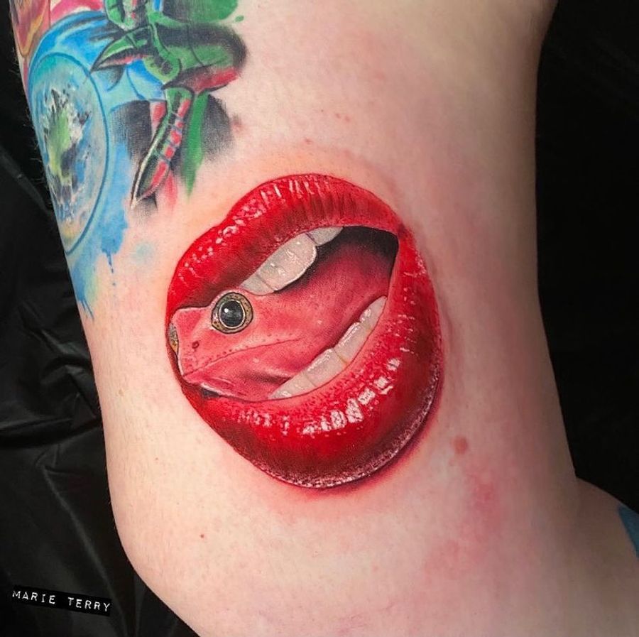 Get a stunning realism tattoo of a frog emerging from a mouth at a reputable studio in London, UK. Expert illustrative style.
