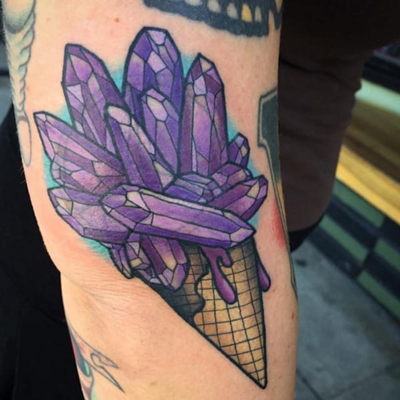 Amethyst crystals ice cream tattoo by Christina Hock, photo: Instagram #crystal #crystalcluster #ChristinaHock #icecream #amethyst