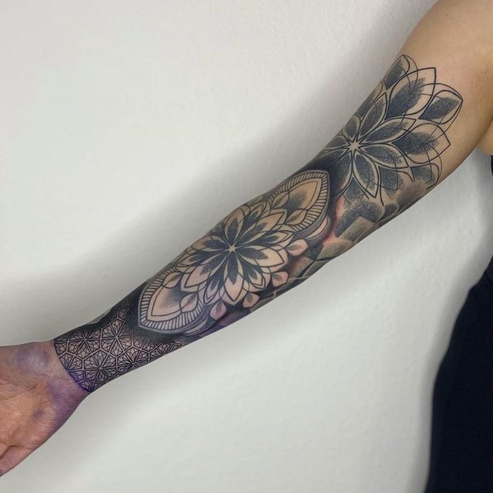Get a stunning geometric mandala tattoo on your forearm in London, perfect for a modern and intricate design.