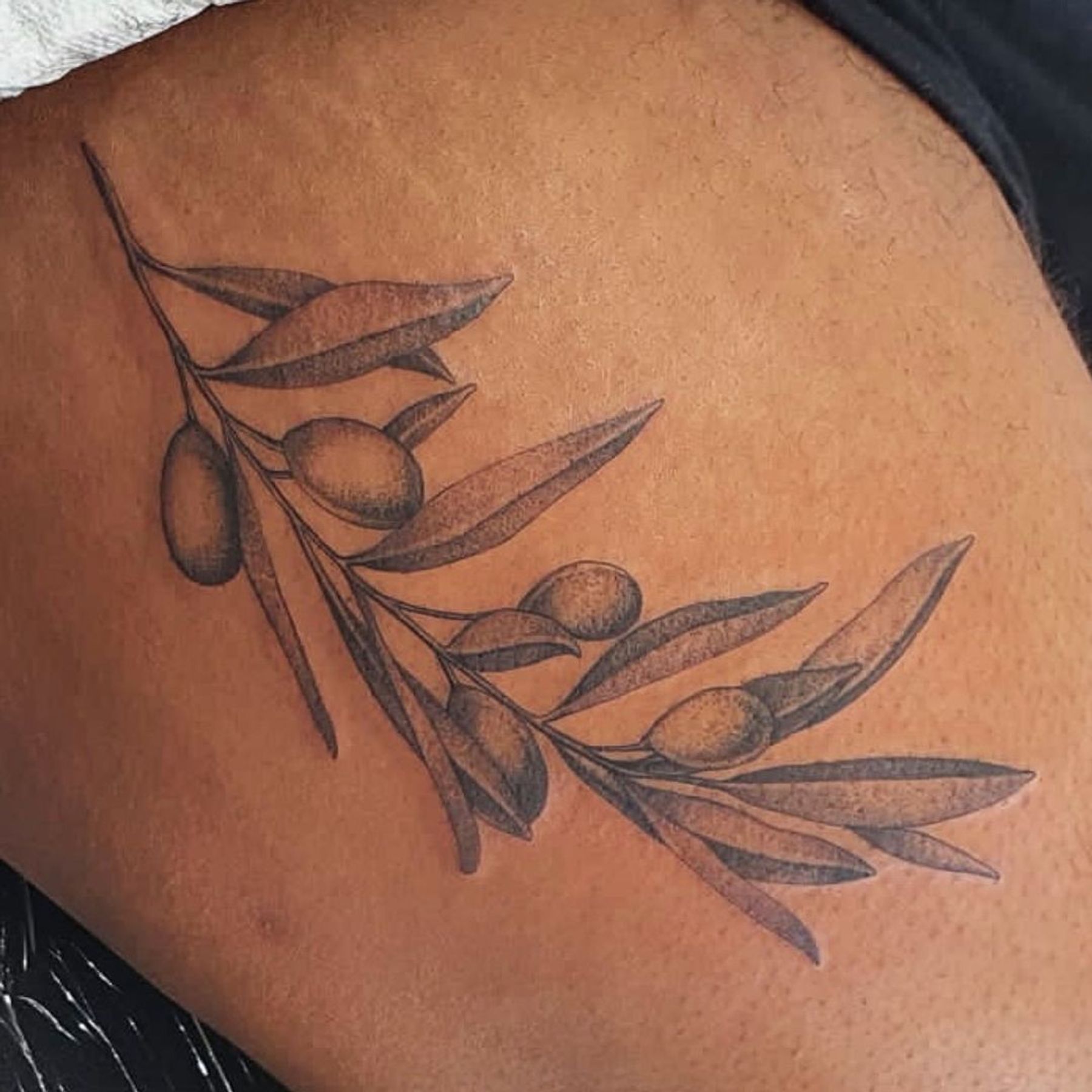 Elegant floral design featuring delicate olive leaves, perfect for upper leg placement in London, GB.