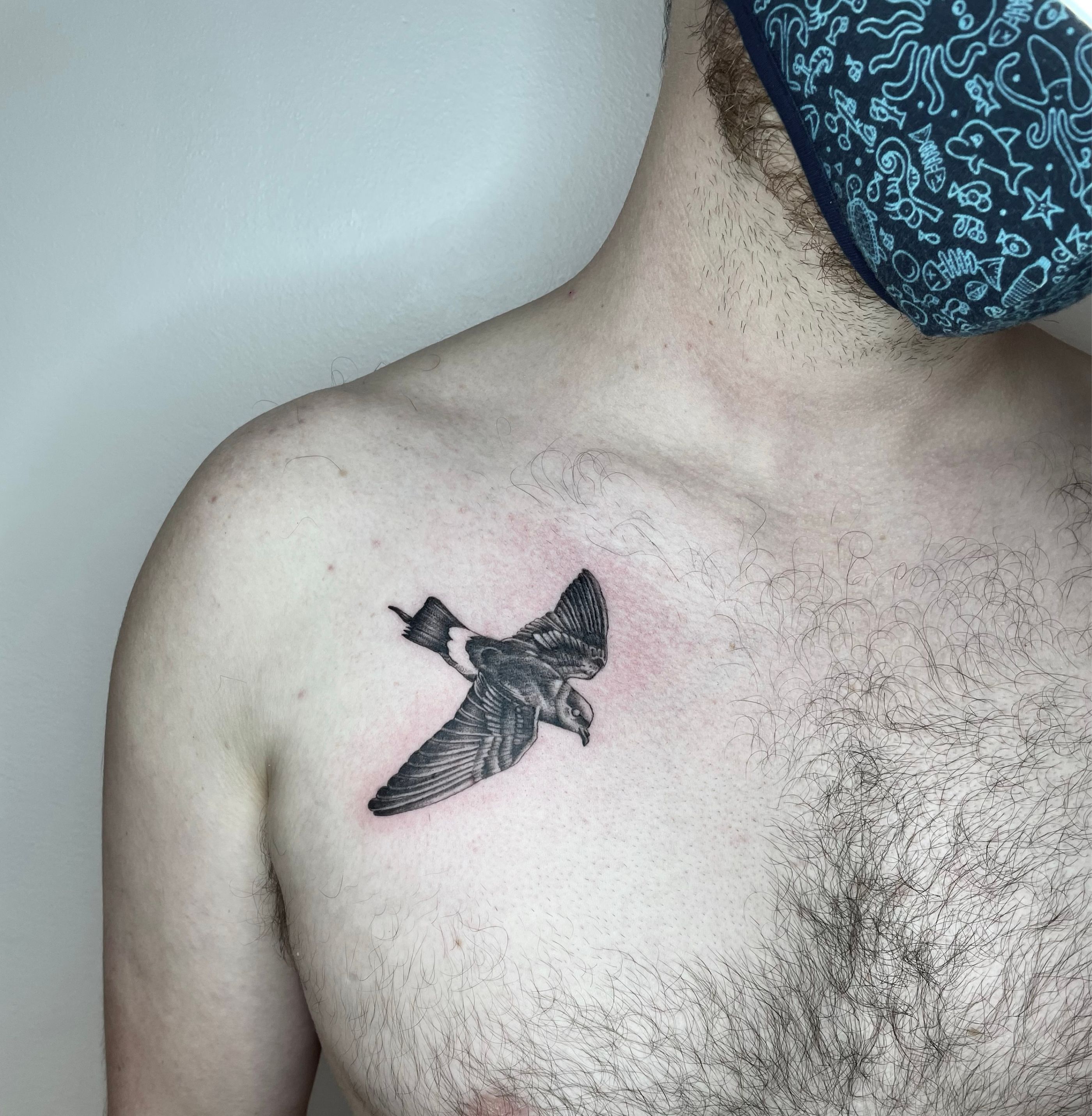A Storm Petrel - a wee little seabird that’s feet extend out behind its tail when it’s flying which is pretty cute. Wikipedia tells me they flutter like bats and I don’t know why I felt the need to tell you that but there you go ☺️ . #stormpetrel #birdtattoo #fineline #bird #london #seabird
