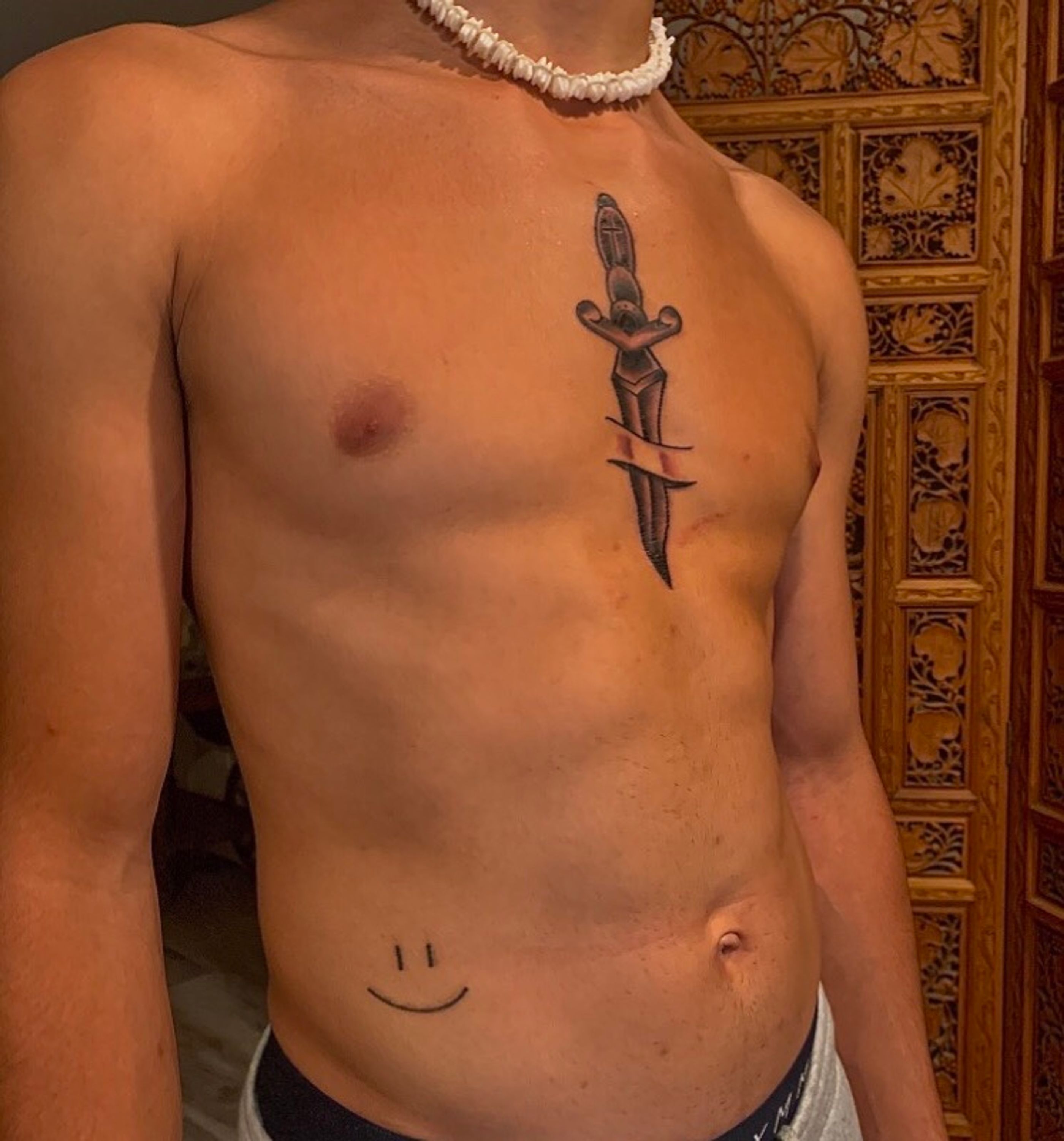 knife tattoo through middle of chest