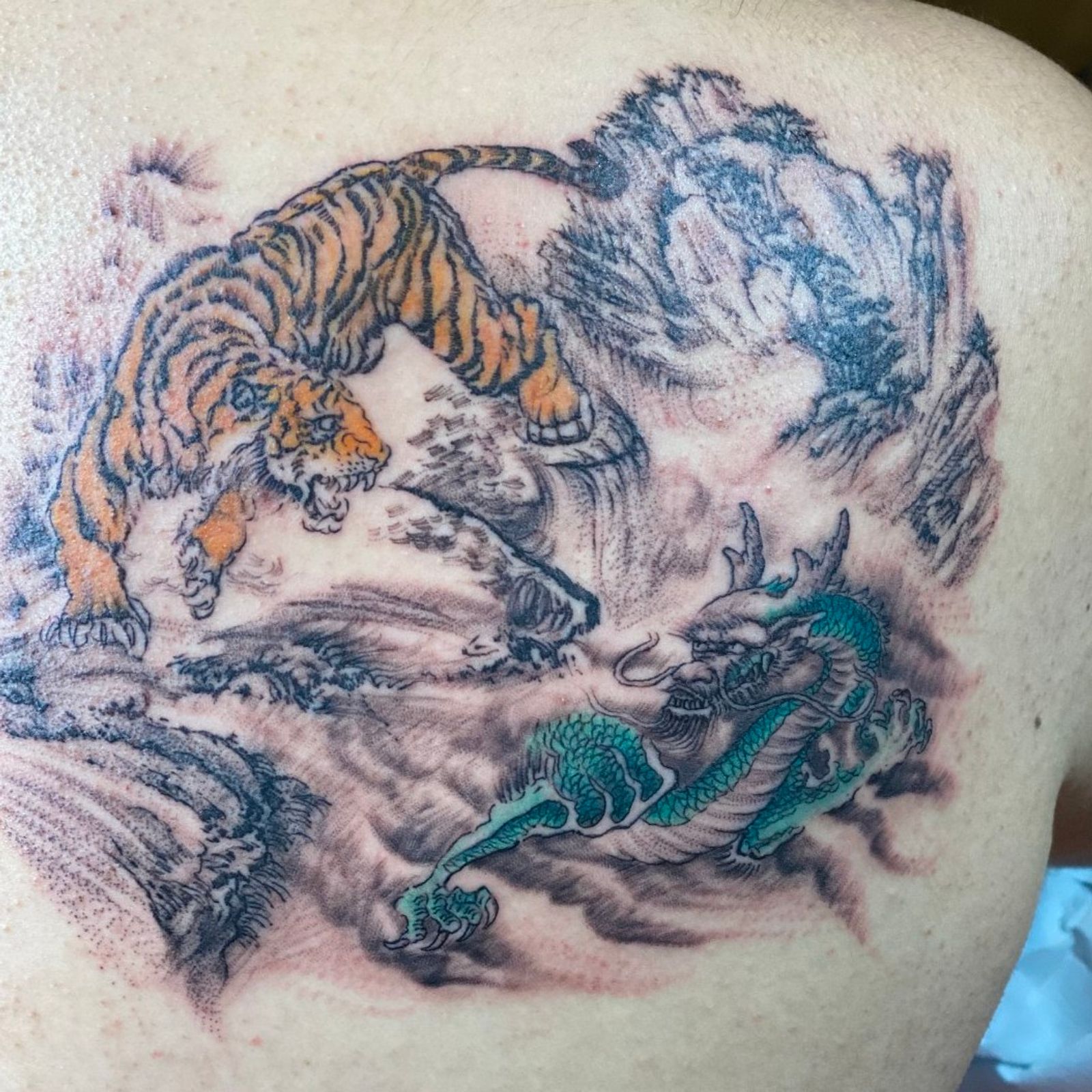 Tiger and Dragon Chinese painting style. My first tattoo!