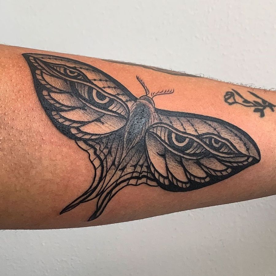 Get a stunning blackwork moth tattoo on your forearm in New York for a bold and unique look. Expertly designed and executed in an illustrative style.