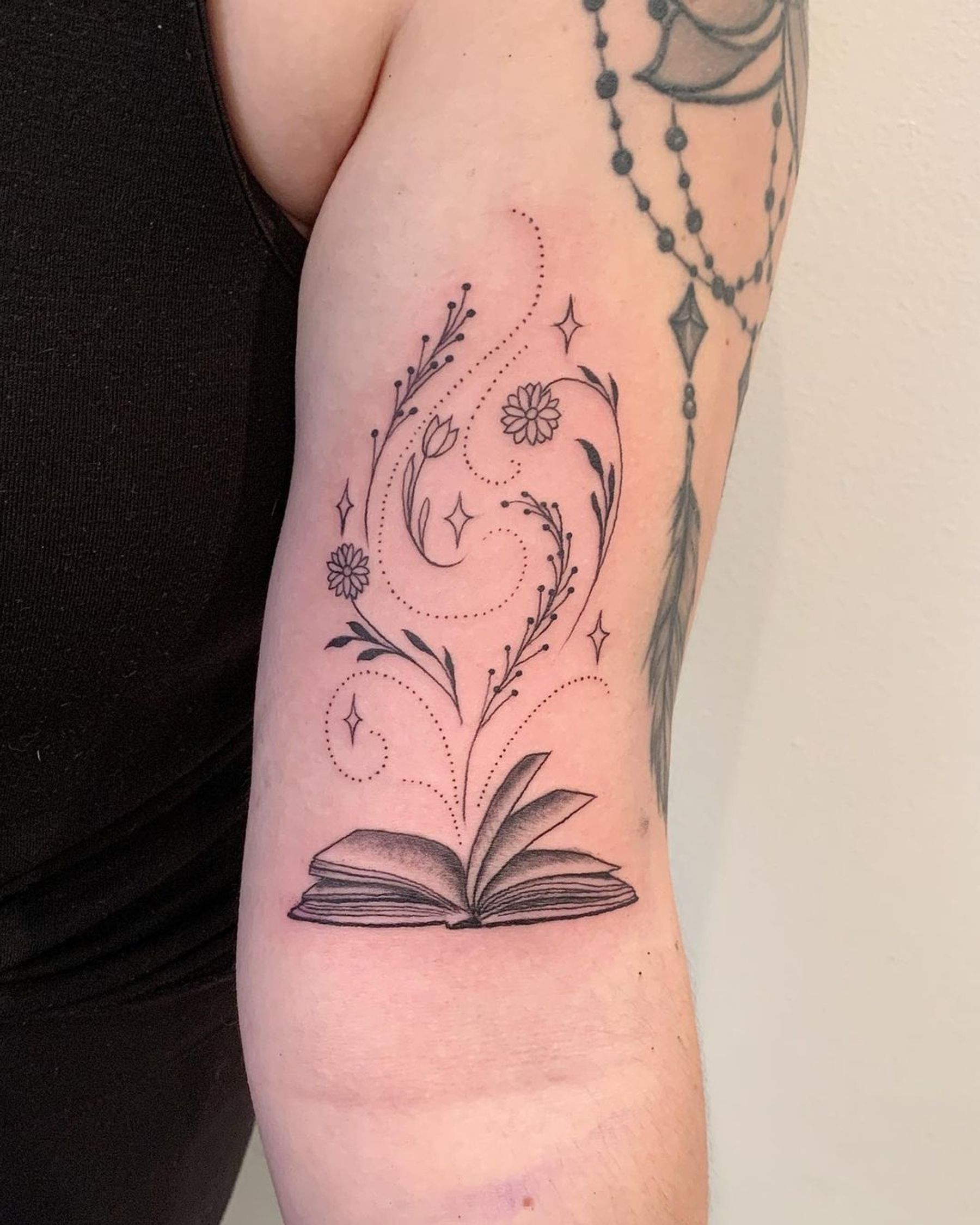 Exquisite book design on upper arm by top artist in New York. Perfect blend of fine lines and illustrative style.