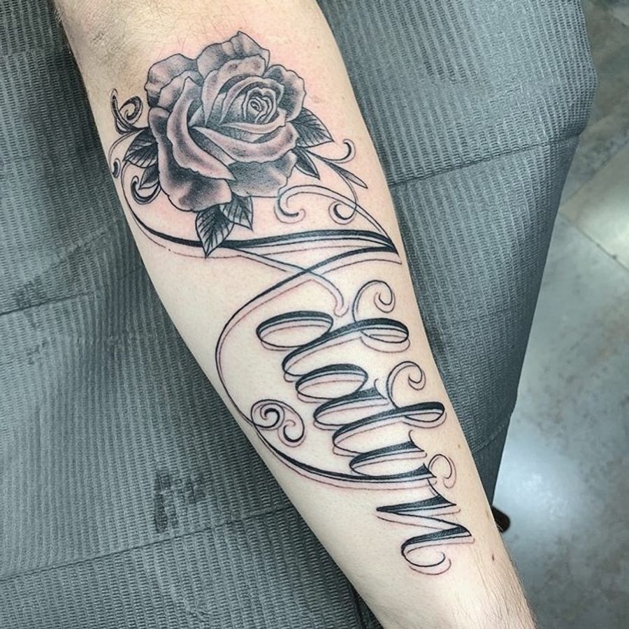 Unique blackwork floral design with illustrative lettering on forearm in Miami.