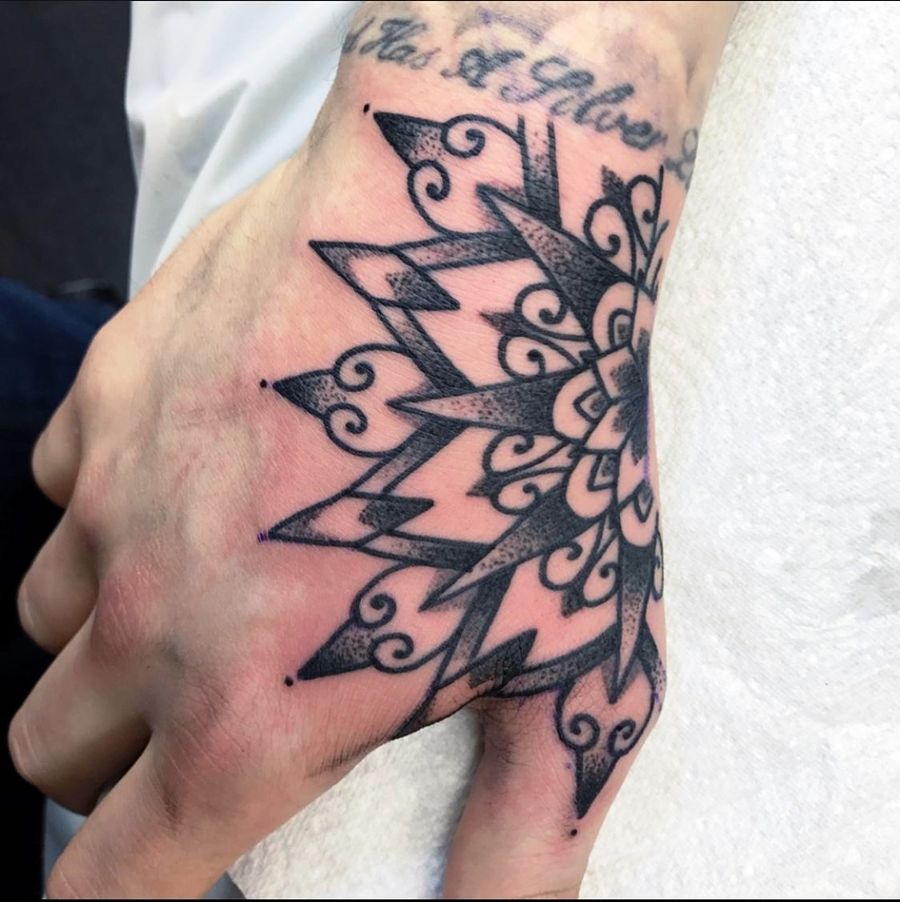 Get a stunning geometric mandala tattoo on your hand in London, GB. Intricate and illustrative design.