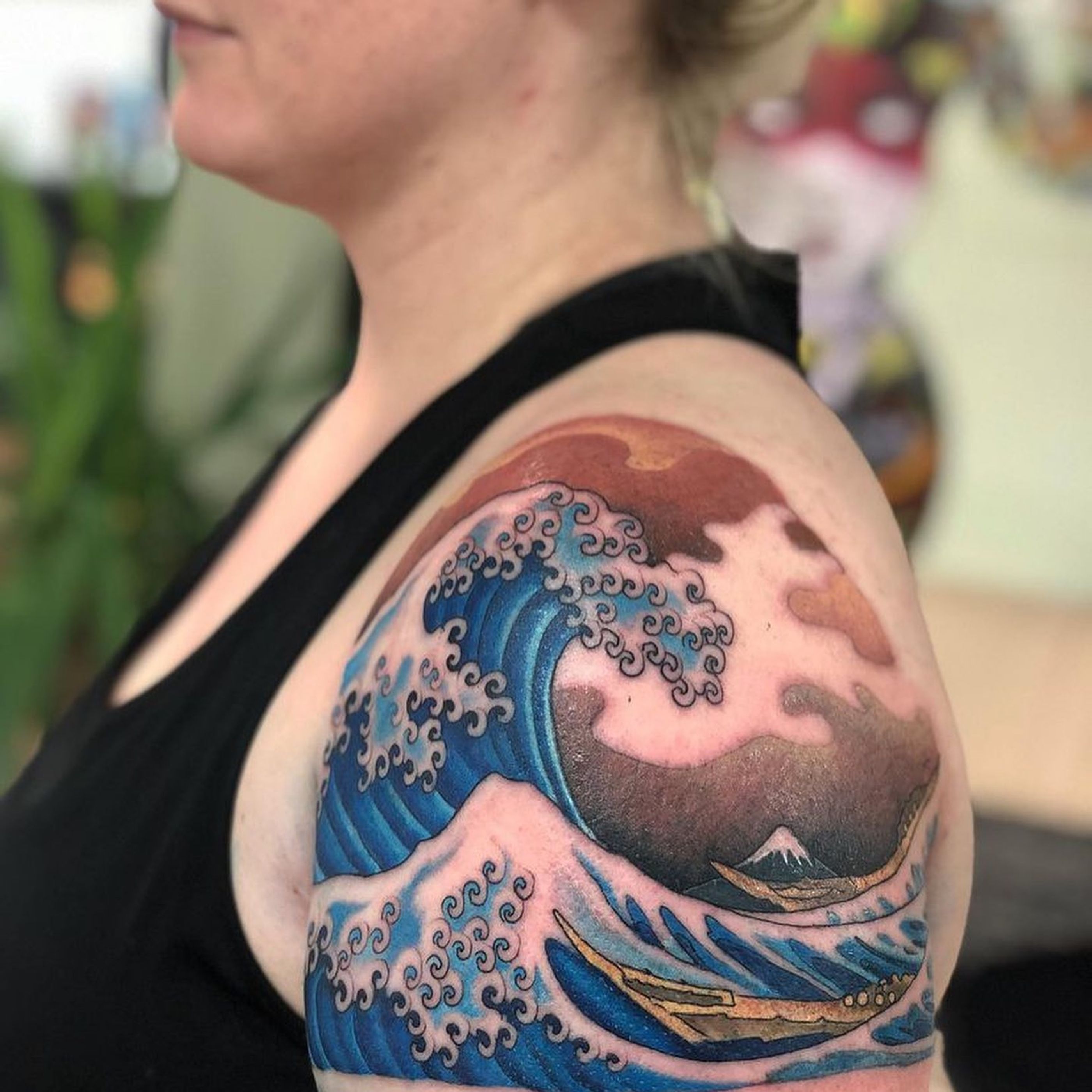 Get a stunning illustrative Japanese wave tattoo on your upper arm in London, GB. Embrace the power of nature with this timeless design.