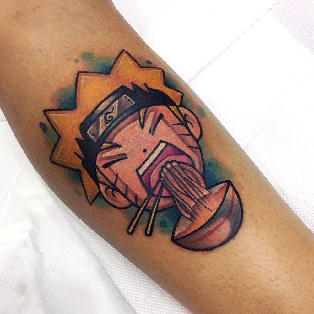 Vibrant and whimsical new school tattoo on forearm featuring a noodle bowl, chopsticks, and cameo by Naruto.