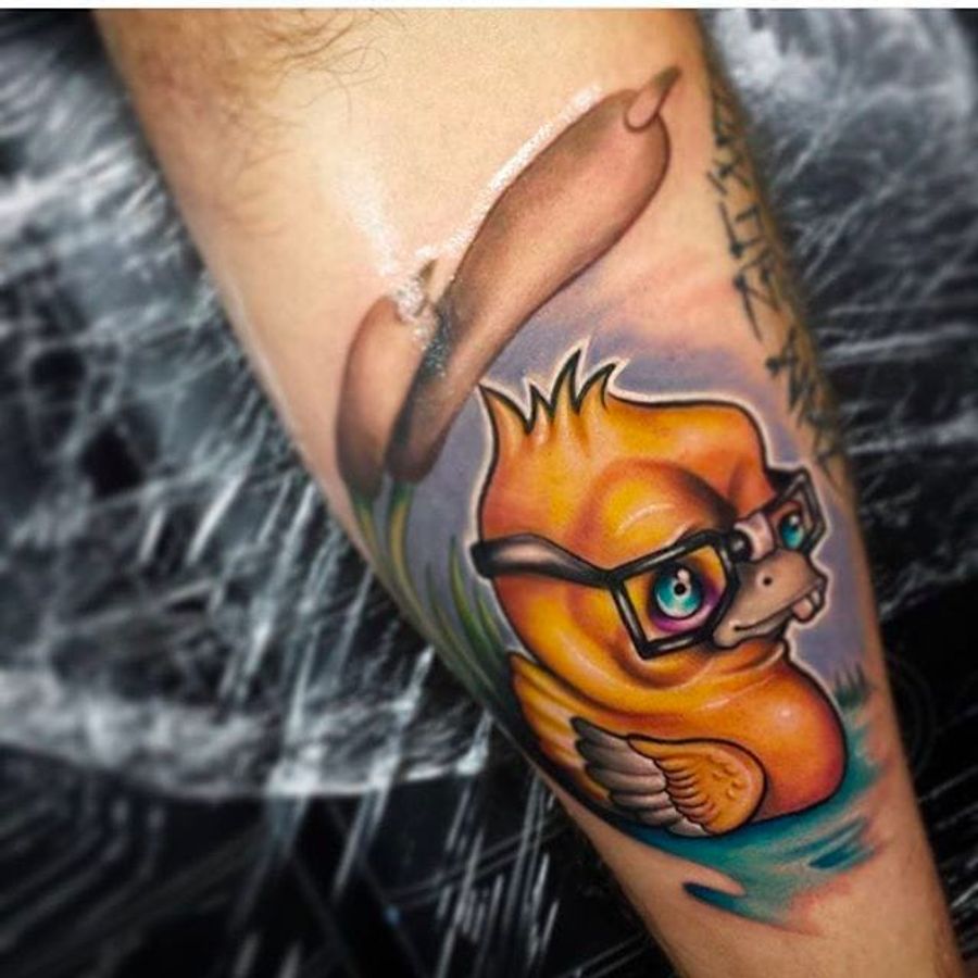 Little geeky duck tattoo by Josh Herman. #JoshHerman #MAYDAYtattoo #NewSchool #ColoredTattoo #duck #duckling