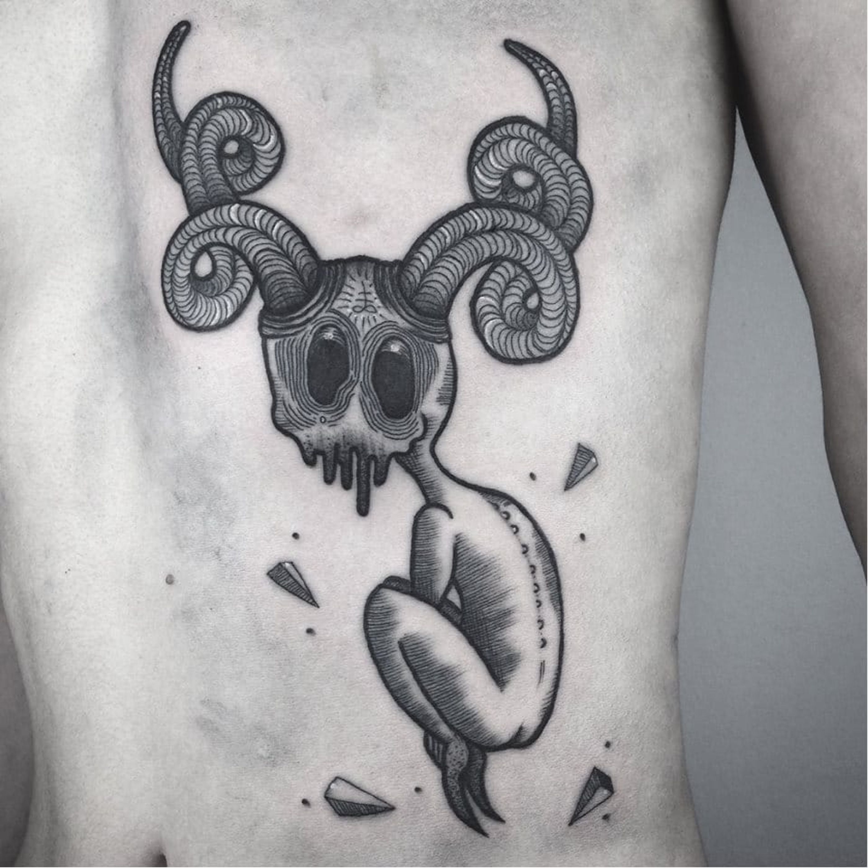 Odd creature tattoo by Tahlz #Tahlz #linework #blackwork #illustrative #ram #horns
