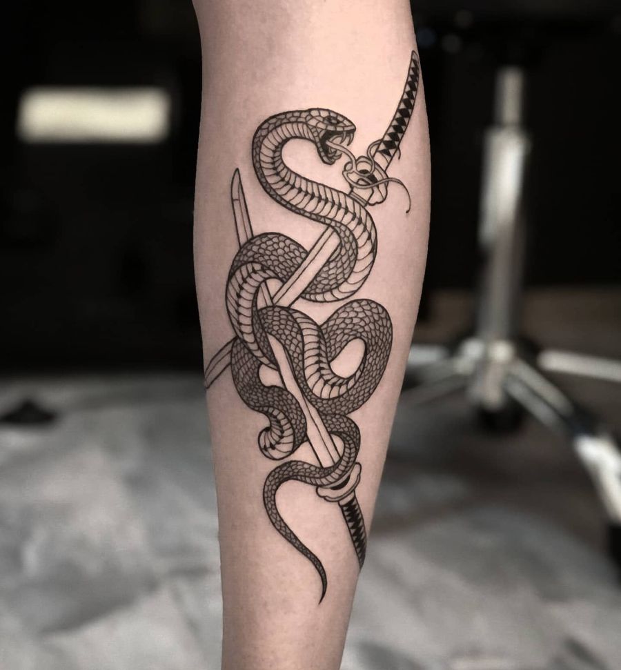 Tatuaj alb-negru cu șarpe și sabie A Touch Of Ink