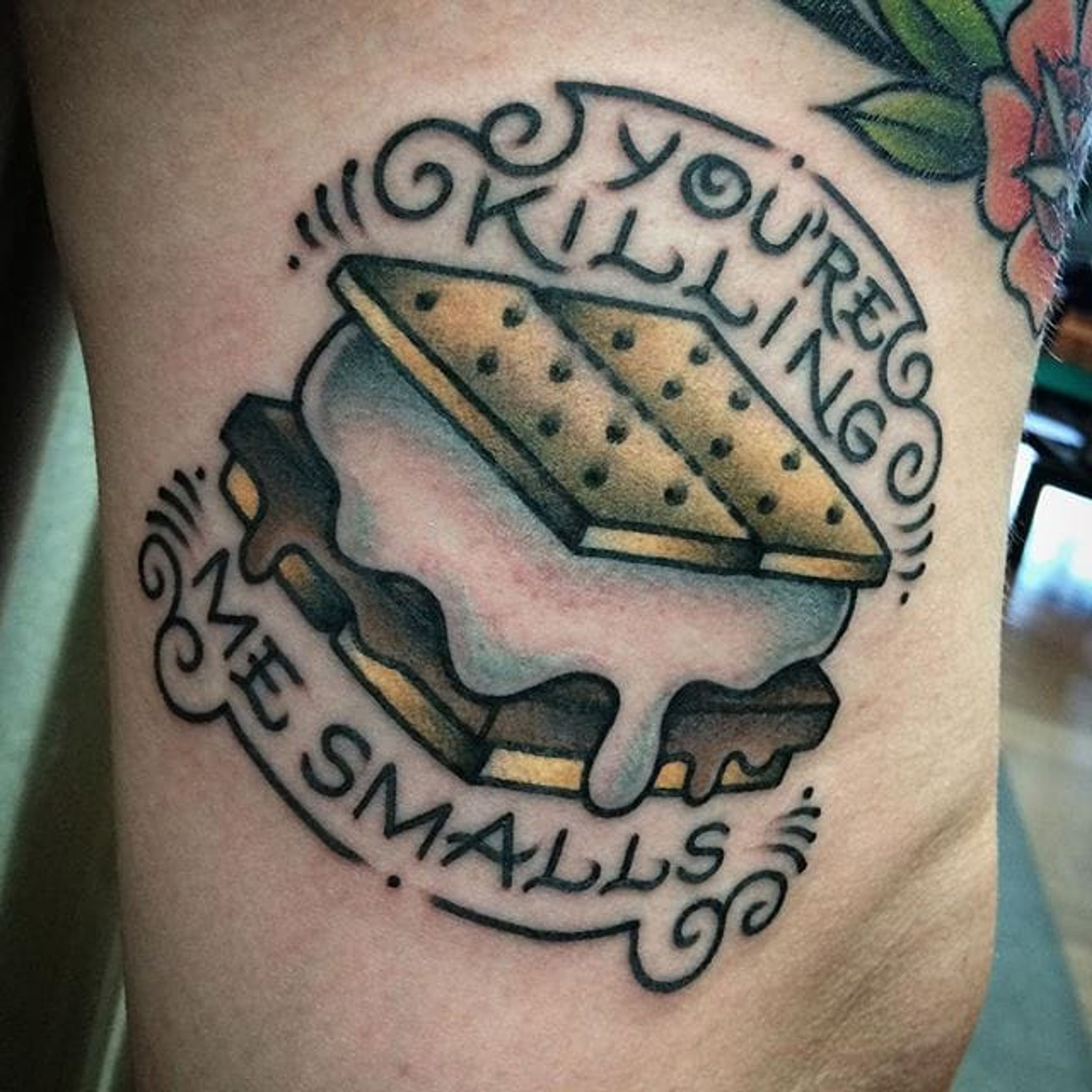 'The Sandlot' inspired s'more tattoo by Amanda Slater. #TheSandlot #smore #marshmallow #toastedmarshmallow #quote #moviequote #lettering #traditional #AmandaSlater