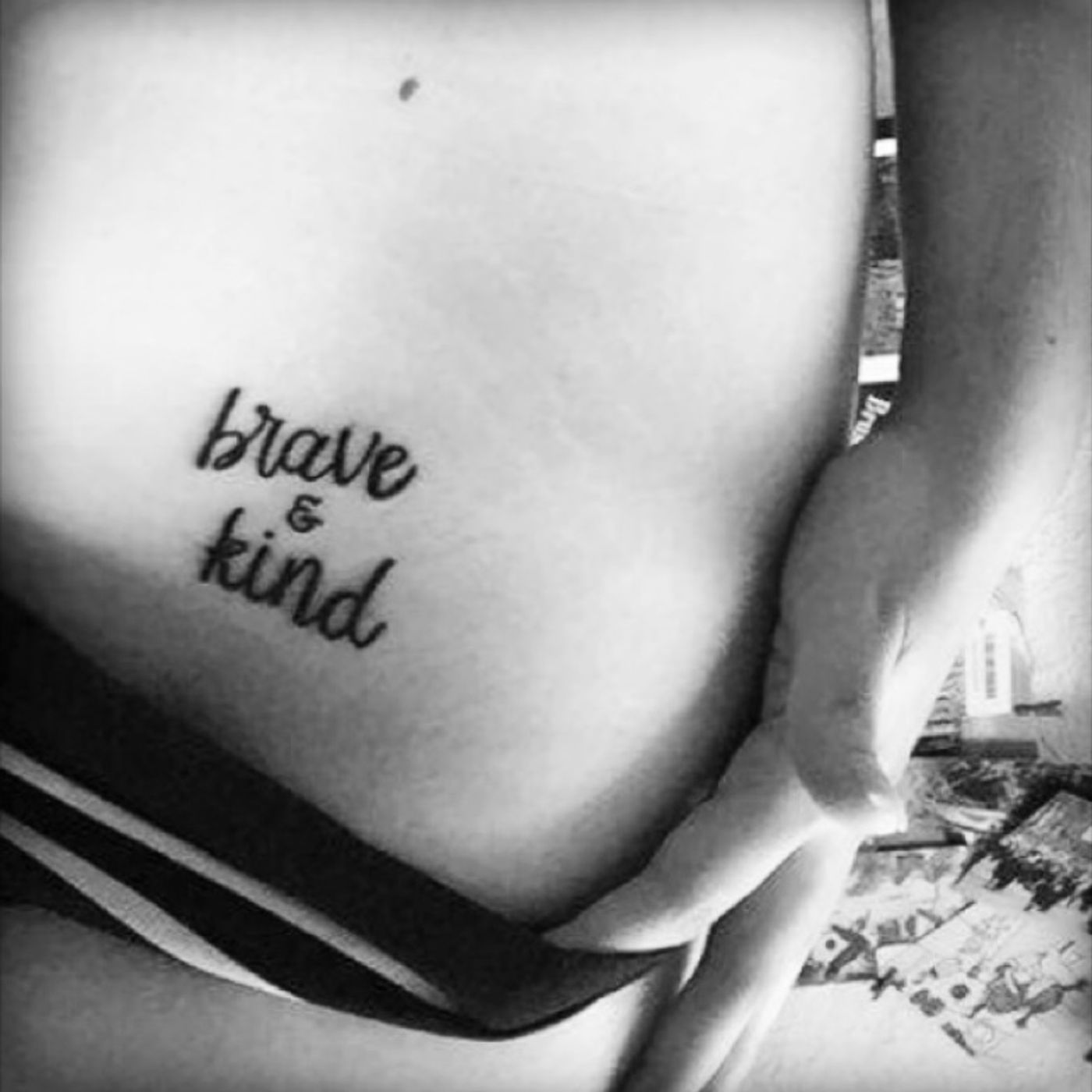 Made by Ferfectus #SoulsAnchorTattooStudio Is not one of my favorites, you can see the word "kind" is faded, so it looks kind of dirty. Still, I like it. #brave #kind #typo #typography #lettering #letter #black #hiptattoos #hip #pelvis #words