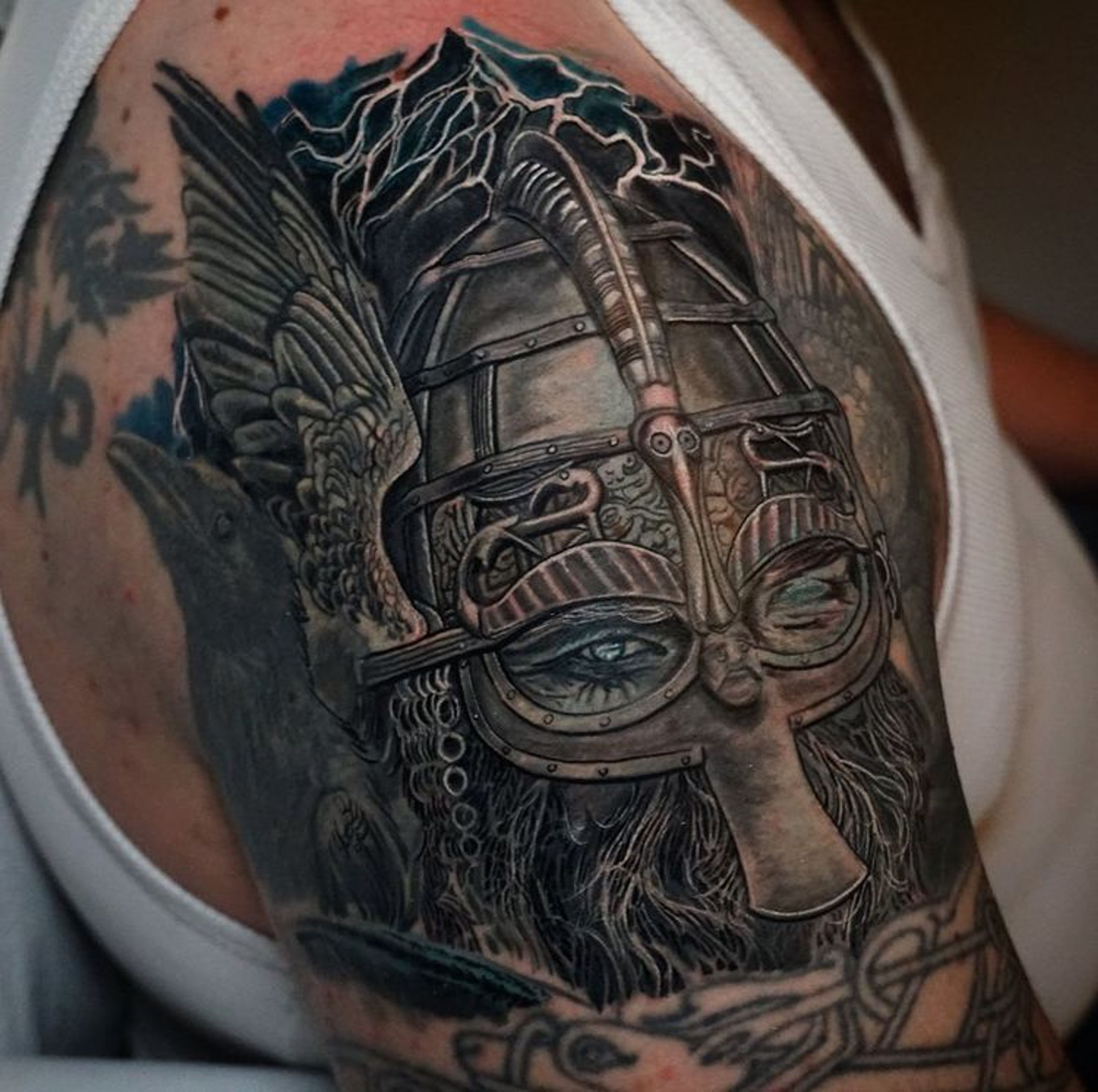 Unique blackwork illustration of a man with helmet, beard, and wings on upper arm, perfect for Chicago residents