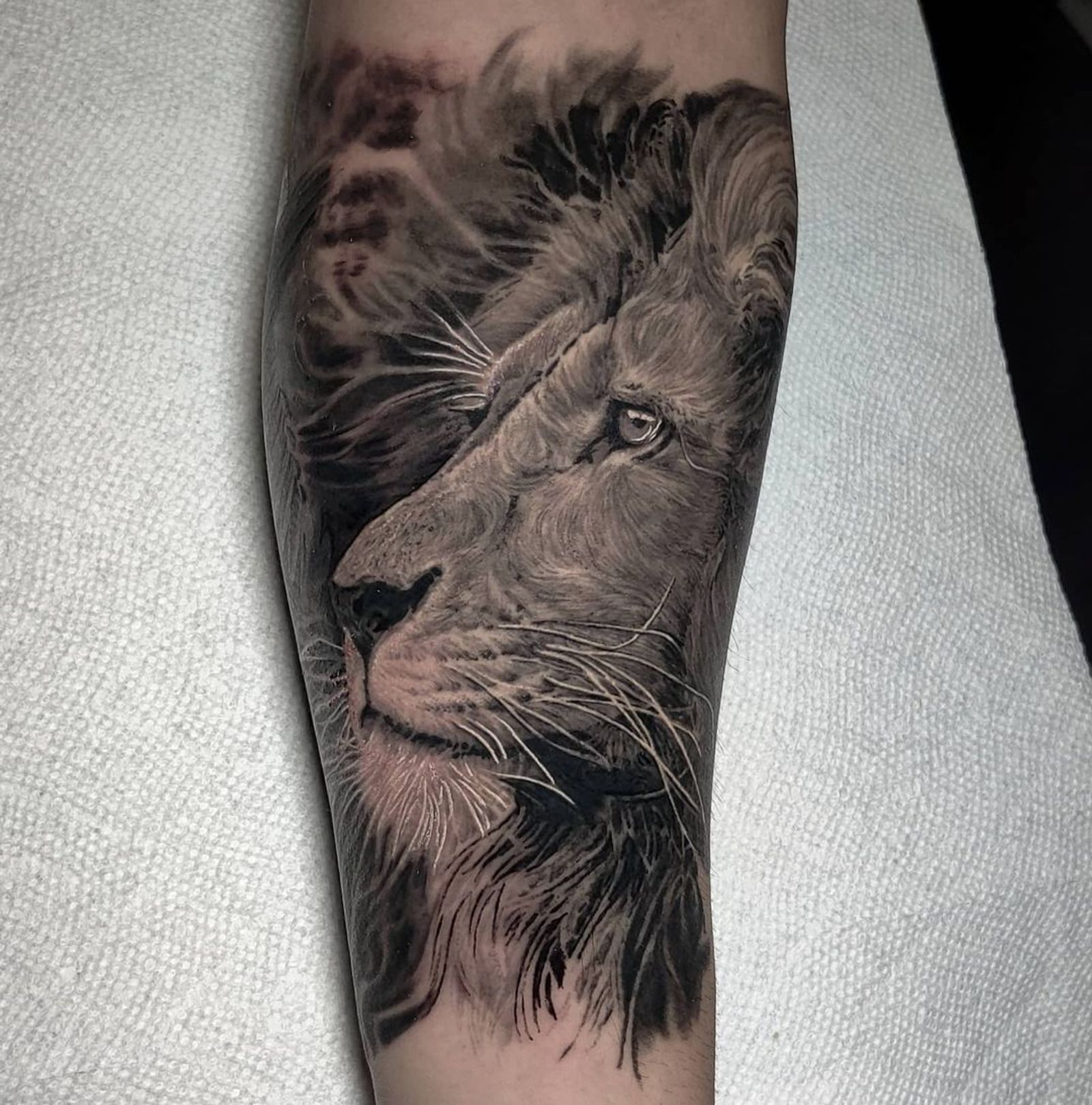 Experience the power of a realistic and illustrative lion tattoo on your forearm in Chicago. Perfect for those who appreciate blackwork style.