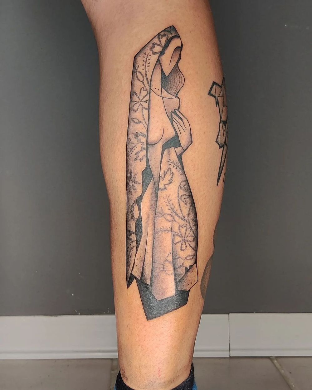 Fine Line Flower and Woman Lower Leg Tattoo