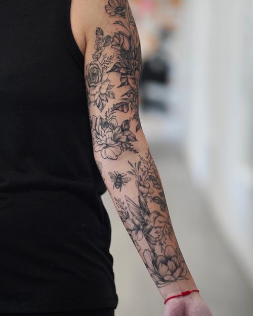 Intricate blackwork design featuring a bird, bee, hummingbird, and flower motifs. A masterpiece of illustrative artistry.