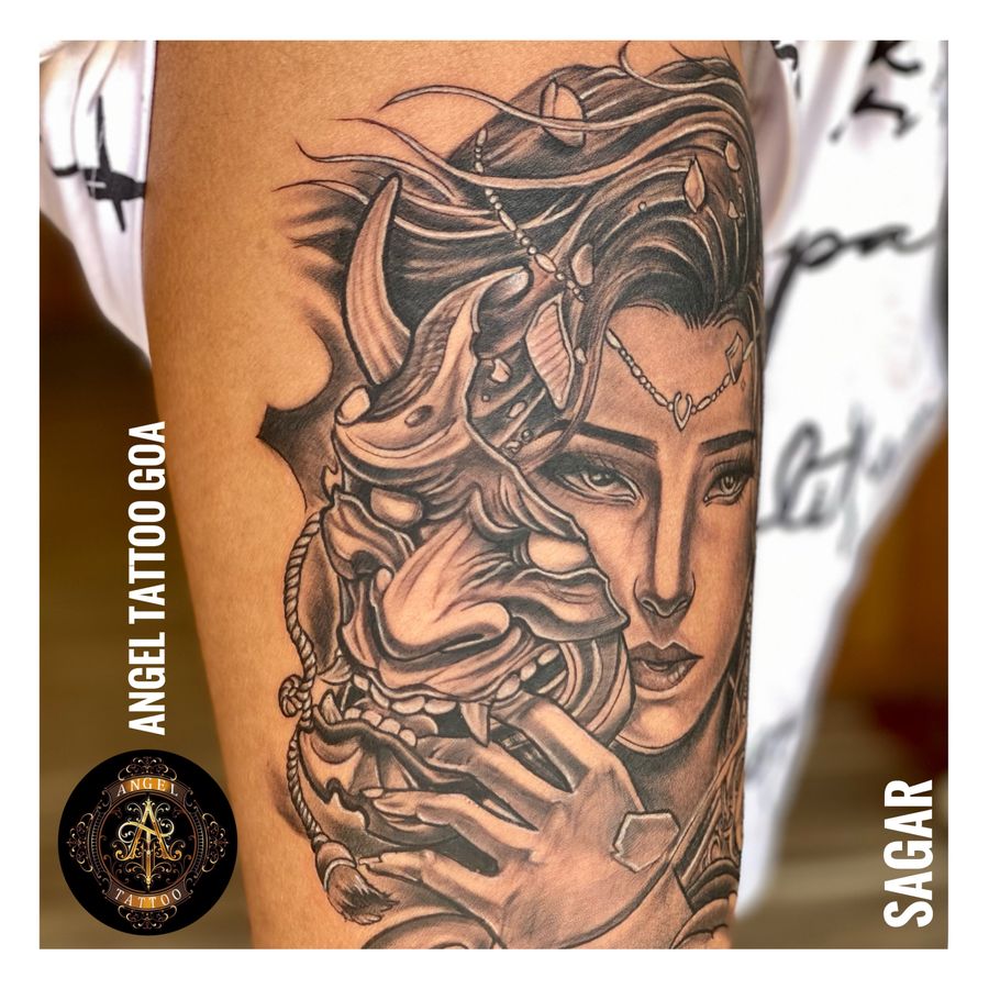Hannya Mask Tattoo By Sagar Dharoliya At Angel Tattoo Goa - Best Tattoo Artist in Goa - Best Tattoo Studio in Baga Goa - Best Tattoo Shop in Goa